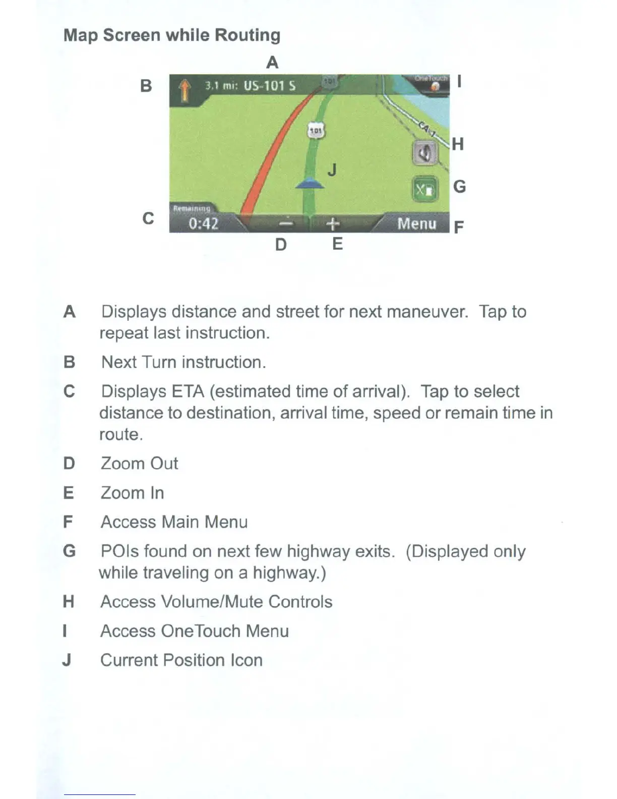 A Displays distance and street for next maneuver.