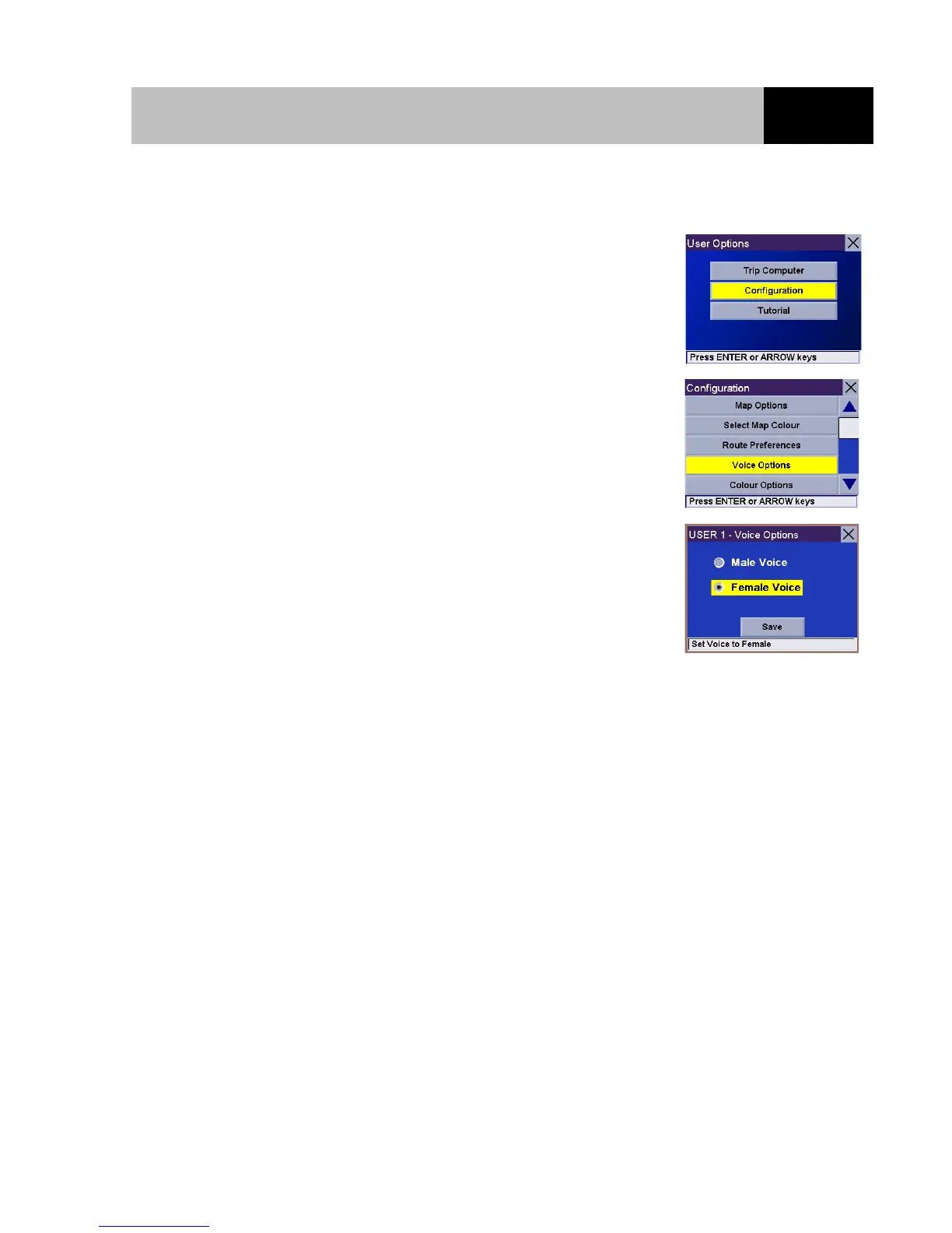 Use the 8-way arrow keypad to select the Male or Female voice for