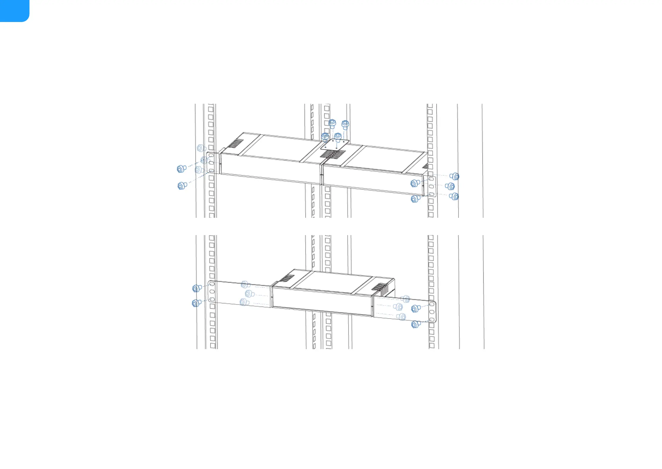 You can install two devices side by side in a 1U rack with provided short rack ears and retainer plate, see Fig1, or one device with provided long rack ears, see Fig2.