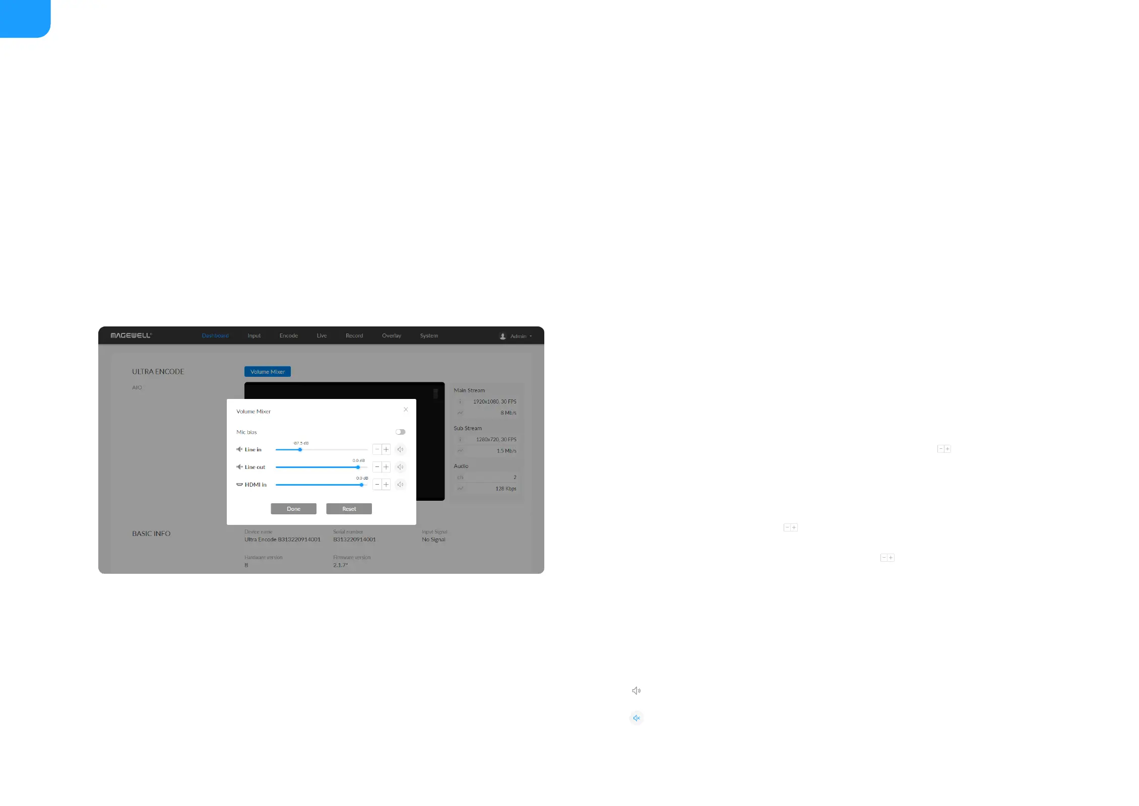 HDMI/SDI IN: adjust input signal volume. Click to fine tone the volume