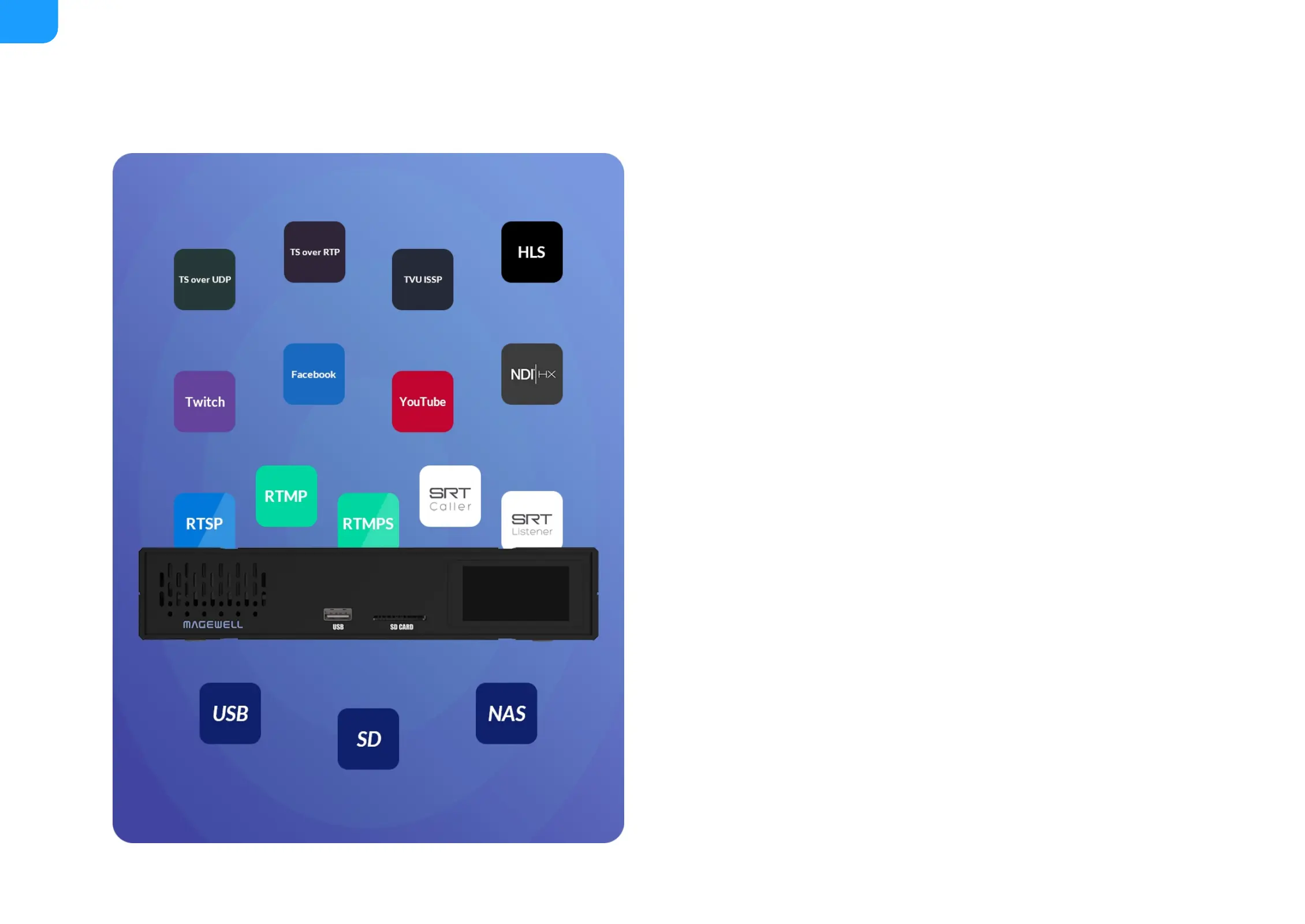 including RTMP, RTMPS, SRT, RTSP, RTP, HLS, TS over UDP, TS over RTP, and