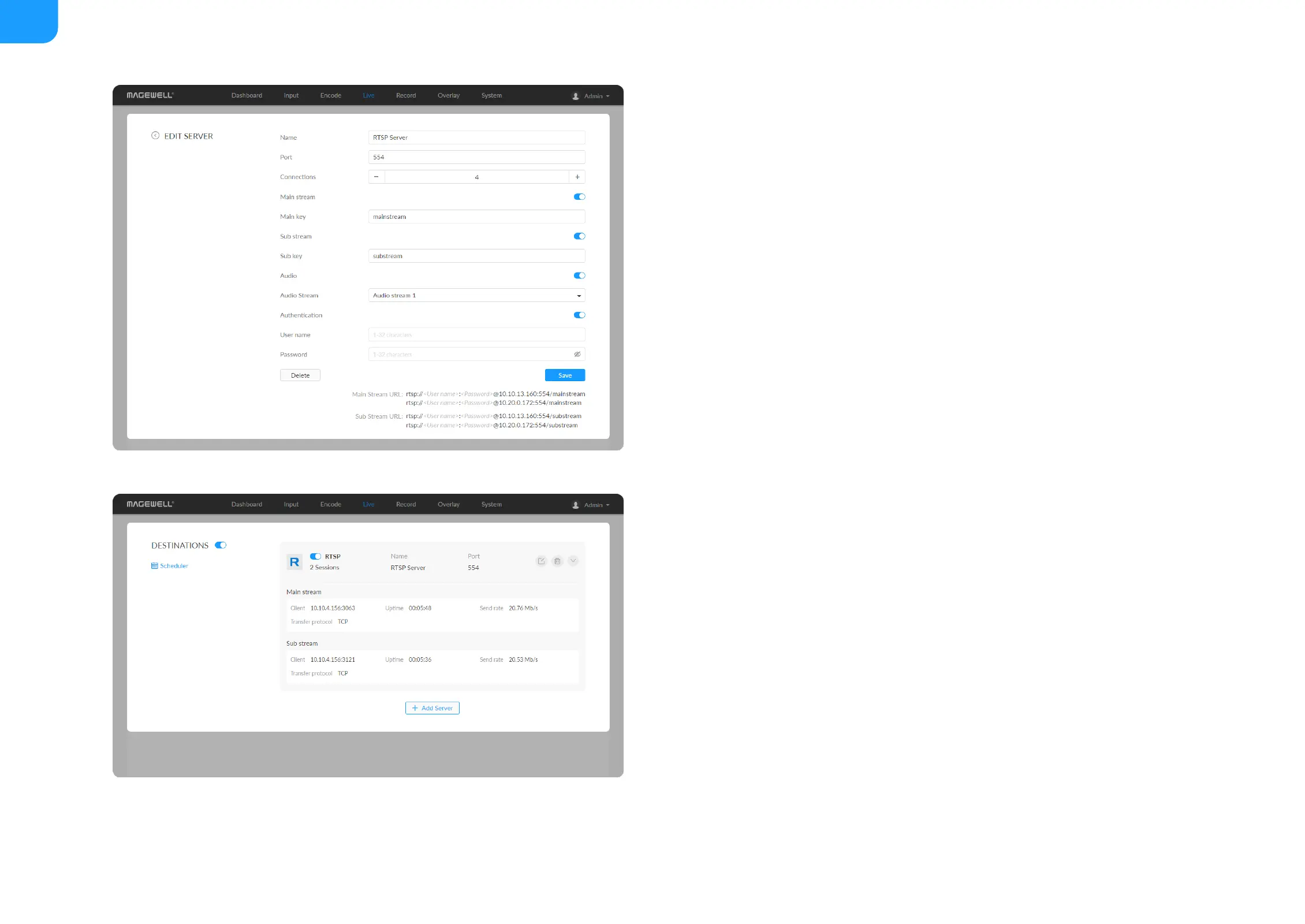 Sub stream: turn on to push sub stream. Specify parameters in Encode tab.