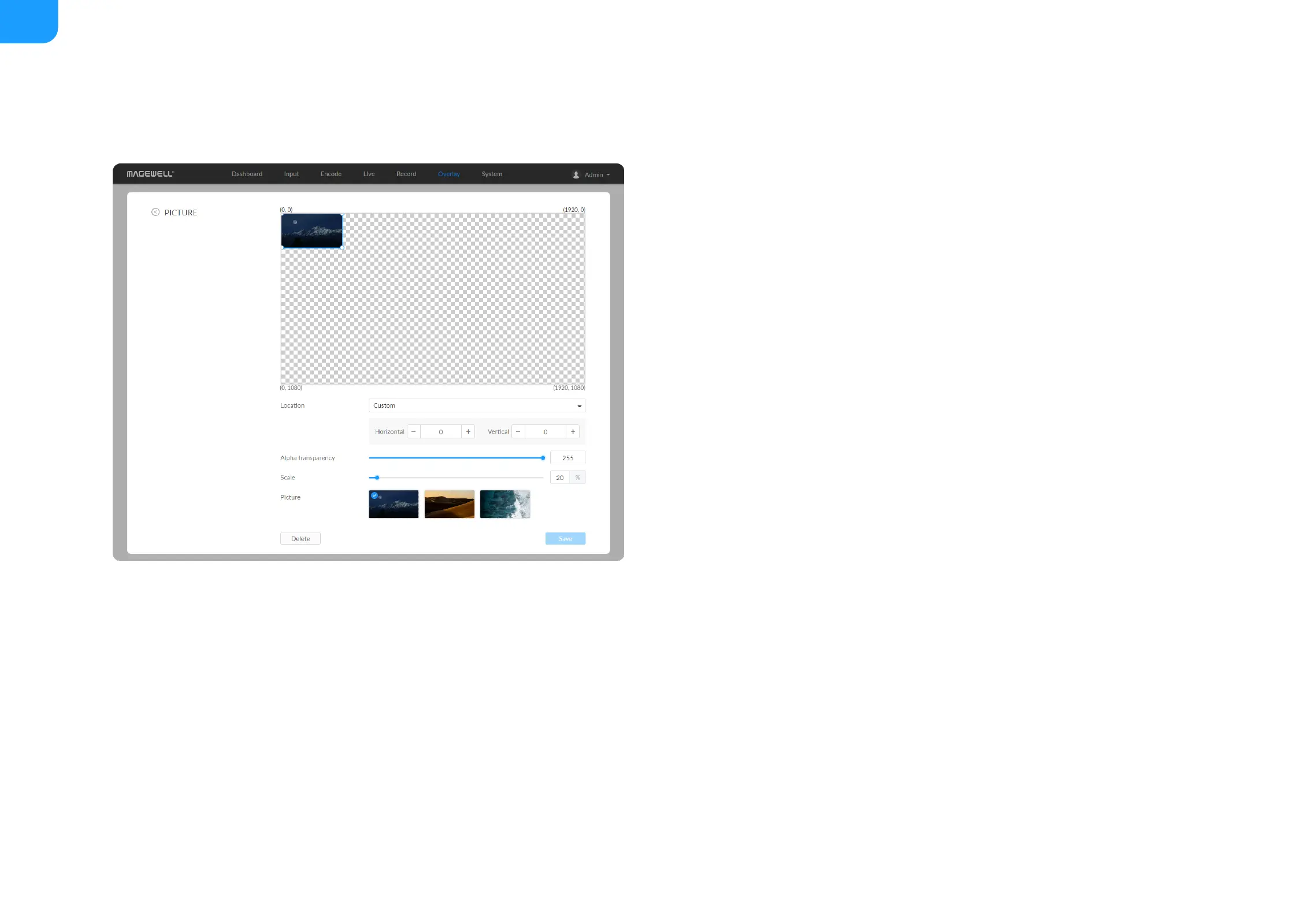 Picture: choose a picture from Overlay > Gallery. There is no picture by