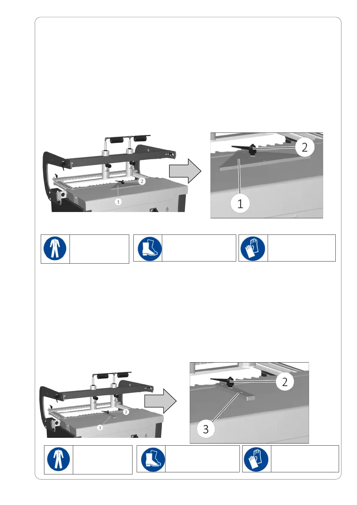 Fasten the triangle (1) on the table in the reference holes and clamp it in the centre hole using the lever (2).