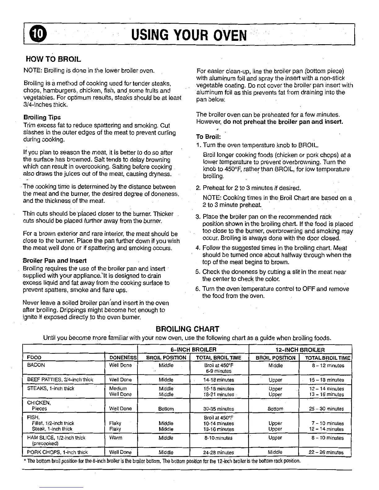 Magic Chef 9112 Gas - How to Broil Food Safely; Broiling Time and Rack Guide