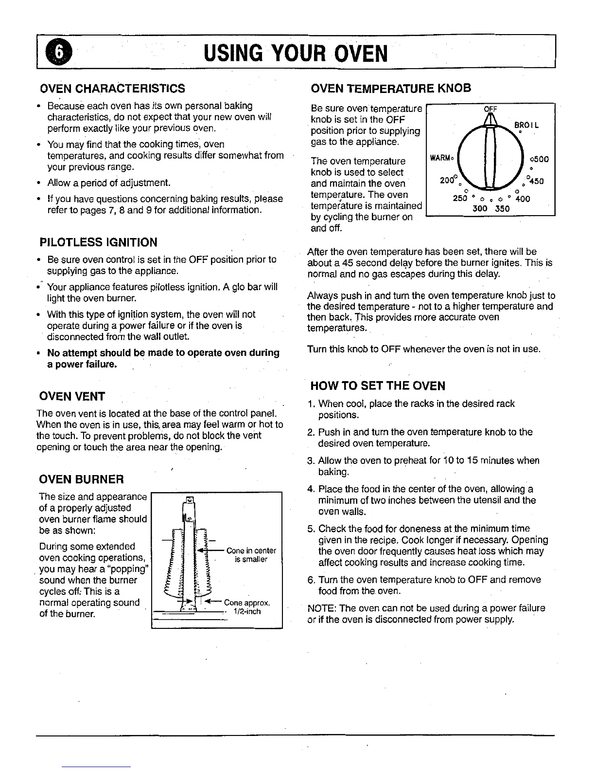 Magic Chef 9112 Gas - USING YOUR OVEN; Oven Temperature Knob Operation; How to Set the Oven Temperature