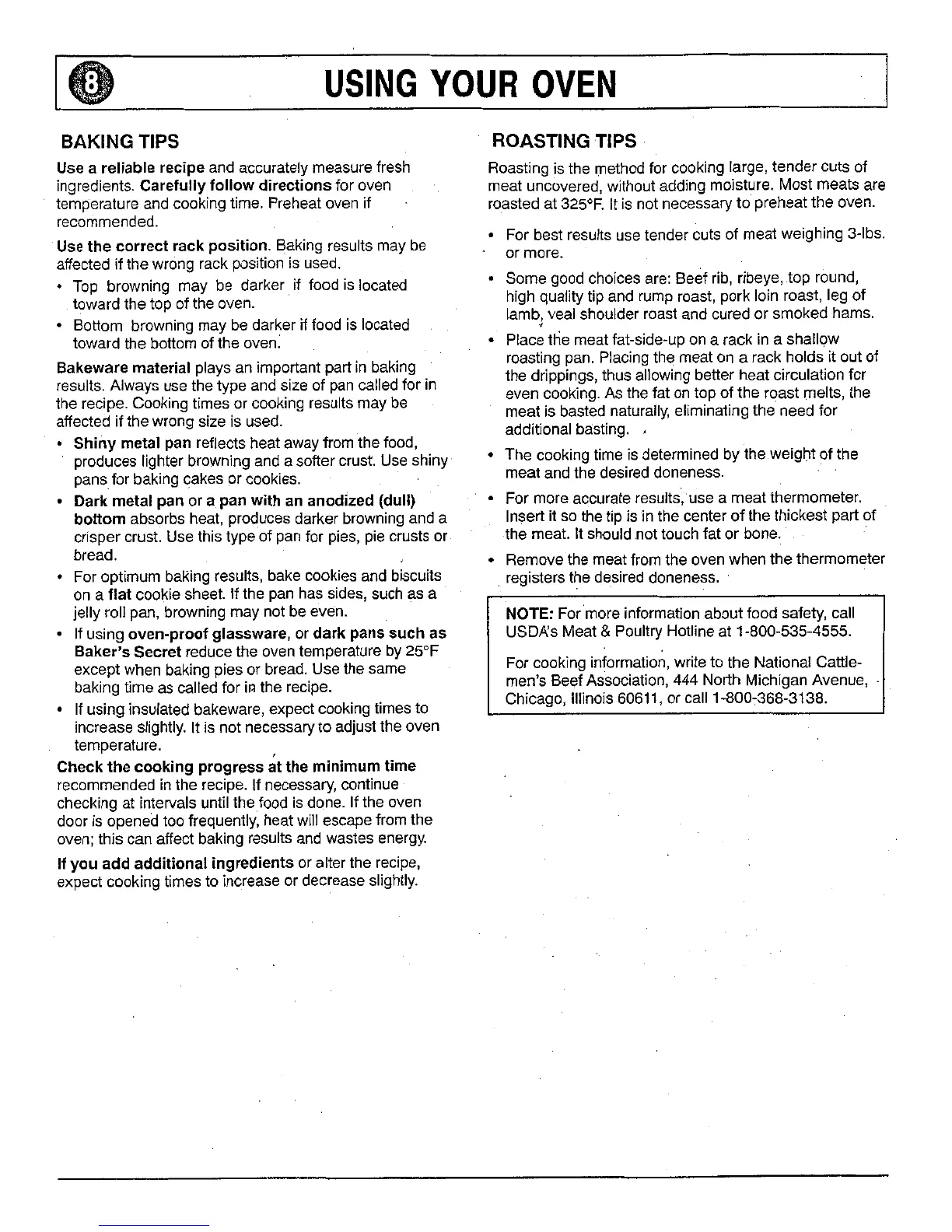 Magic Chef 9112 Gas - Baking Tips and Techniques; Roasting Meats Guide
