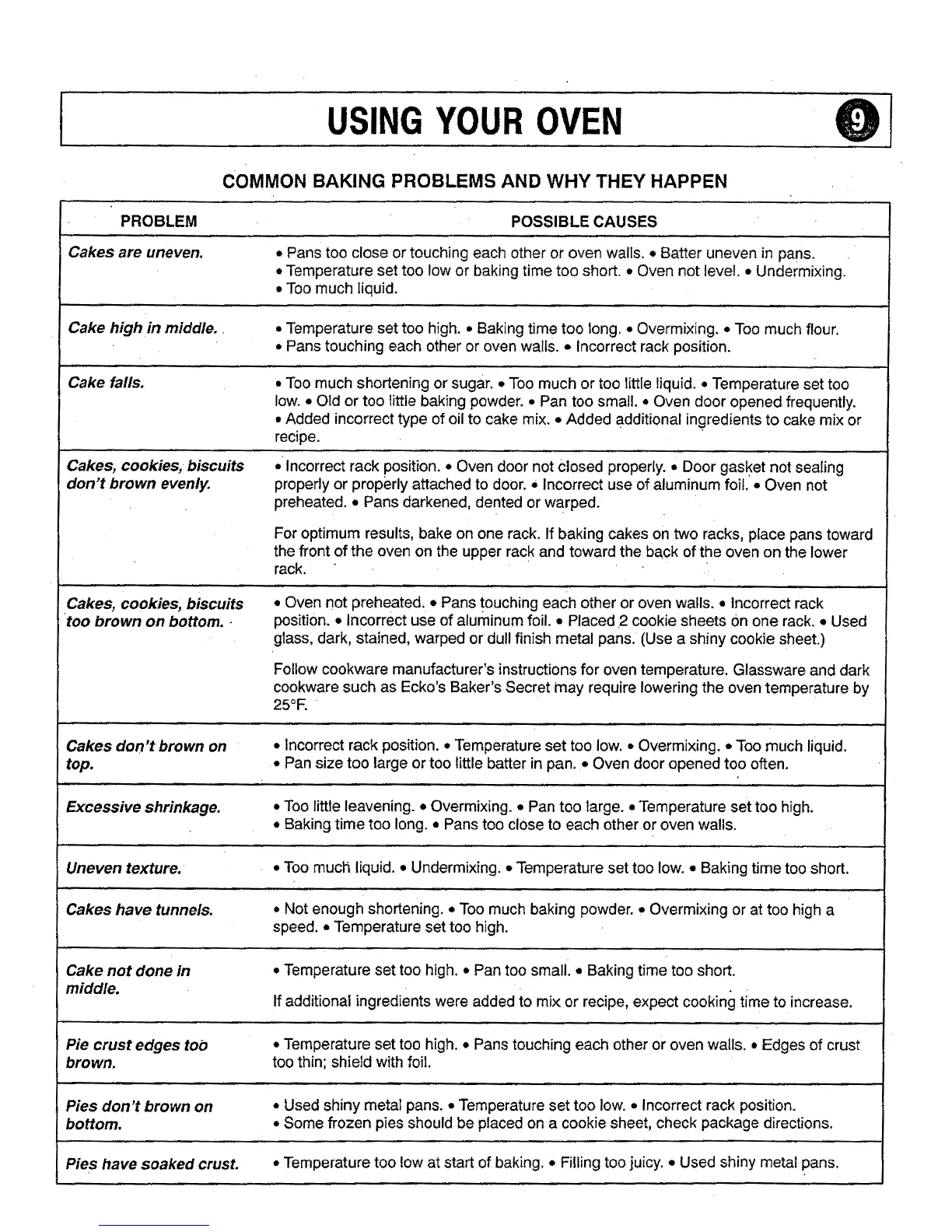 • Oven not preheated. • Pans touching each other or oven walls. • Incorrect rack