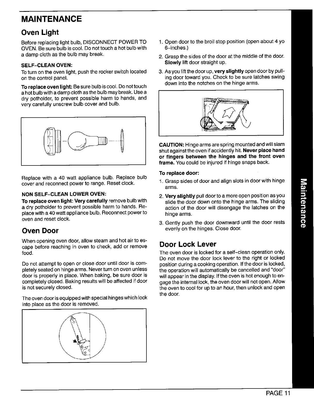 To replace oven light: Very carefully remove bulb with slide the door down onto the hinge arms. The sliding