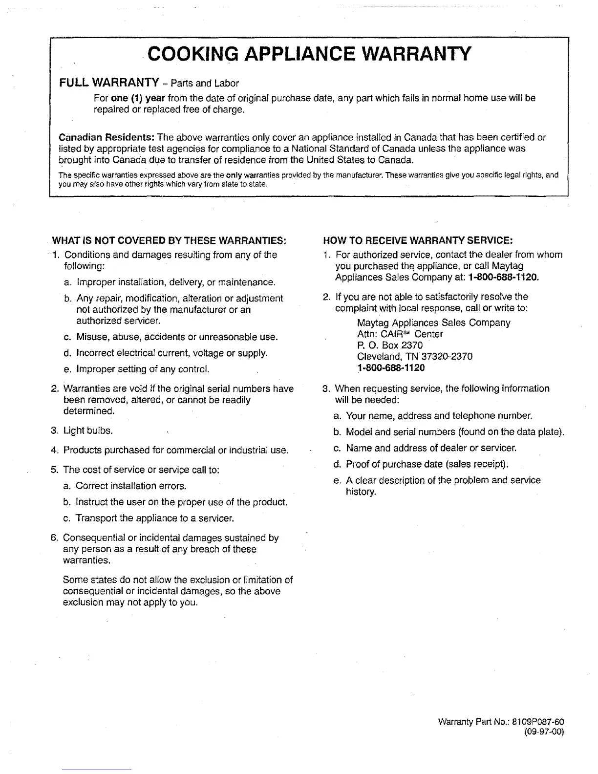 you purchased the appliance, or call Maytag