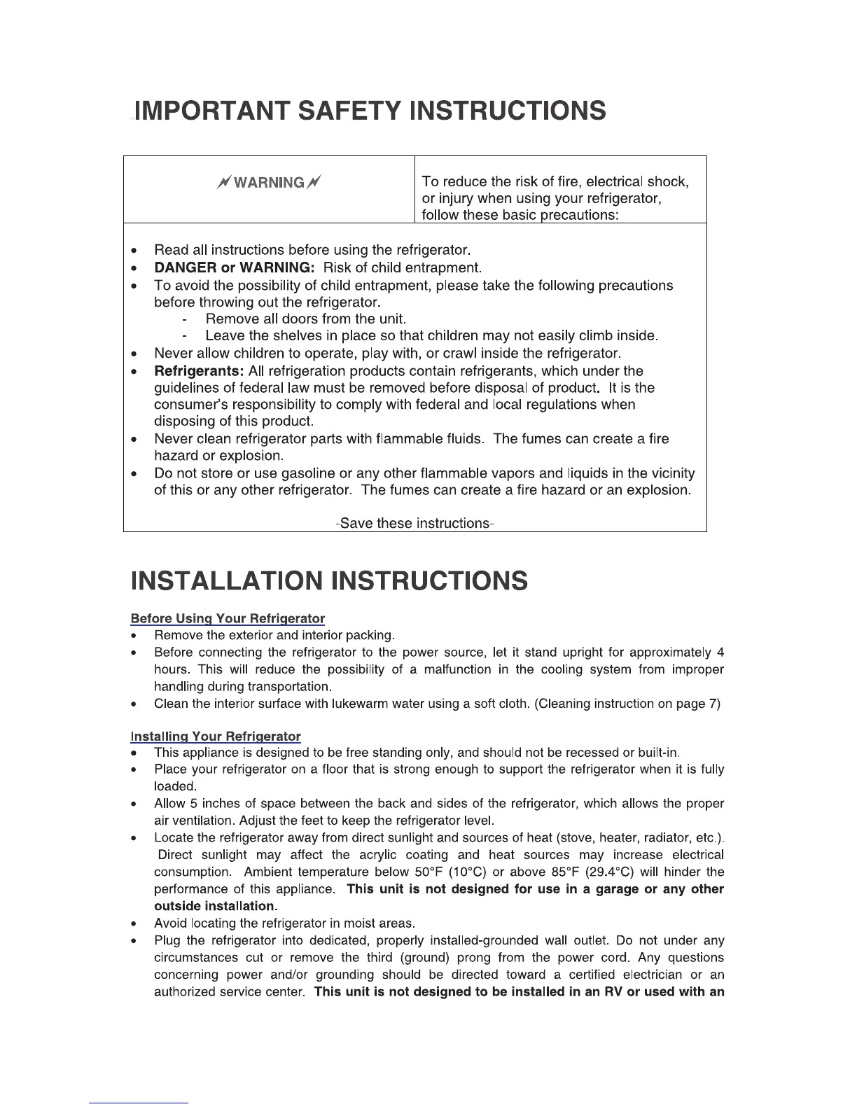 Magic Chef MCAR240B - Important Safety Instructions; Installation Instructions; Before Using Your Refrigerator; Installing Your Refrigerator