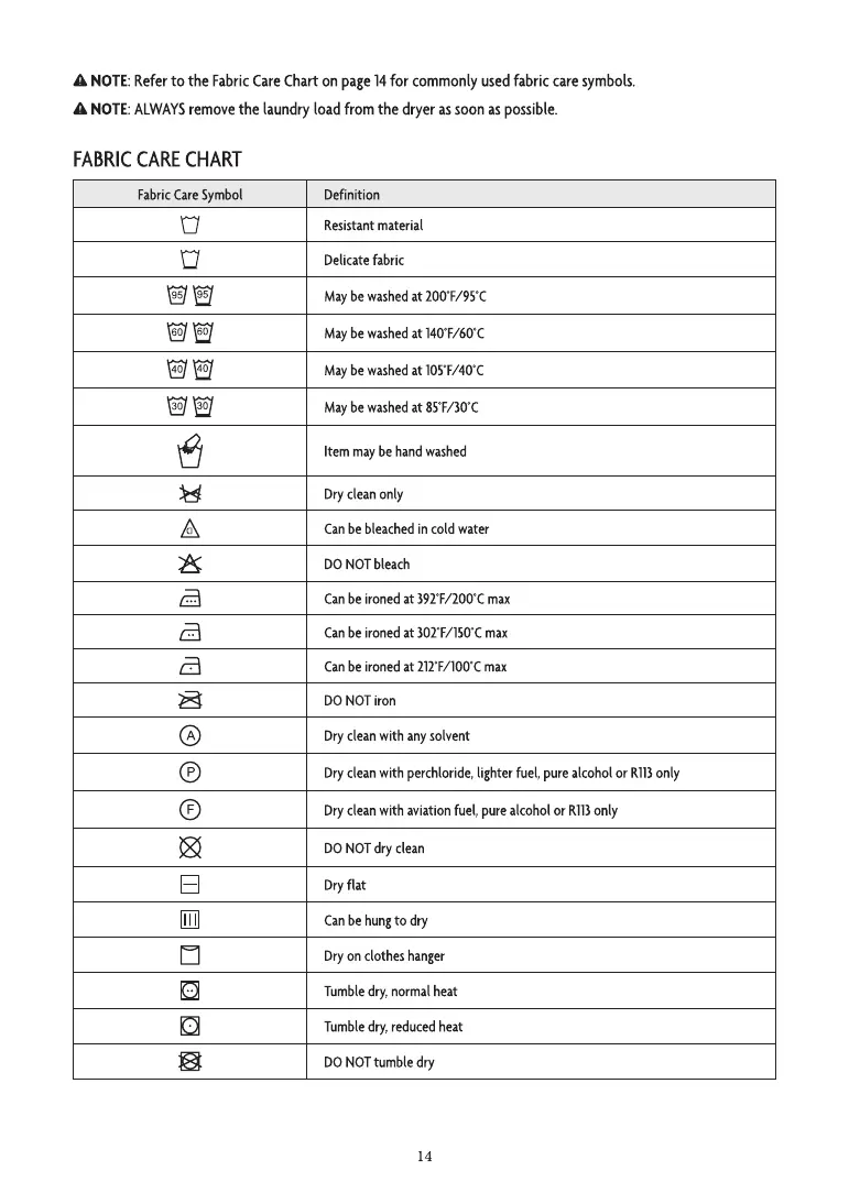 A NOTE:Referto the FabricCareChartonpage14for commonlyusedfabriccaresymbols.