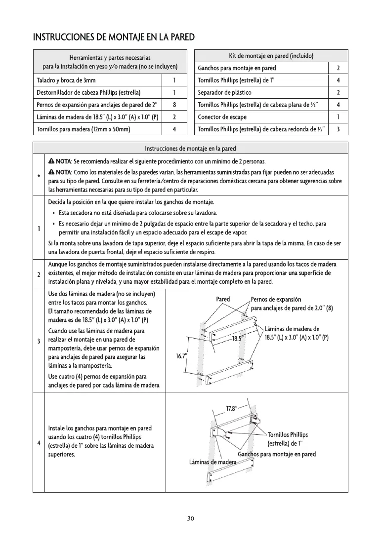 • Esnecesariodejarunminimode2pulgadasdeespacioentrelapartesuperiordelasecadoray eltecho,para