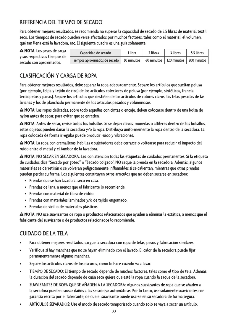 Paraobtenermejoresresultados,serecomiendanosuperarlacapacidaddesecadode5.5librasdematerialtextil