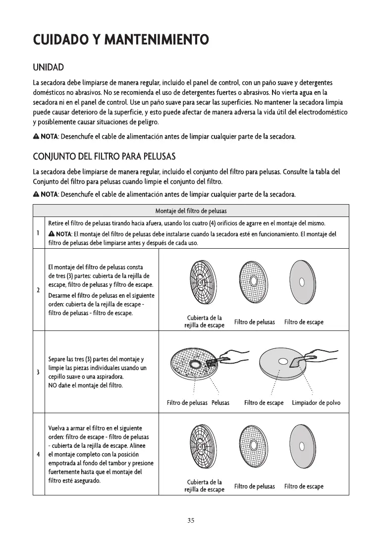 A NOTA:Desenchufeelcabledealimentaciönantesdelimpiarcualquierpartedelasecadora.