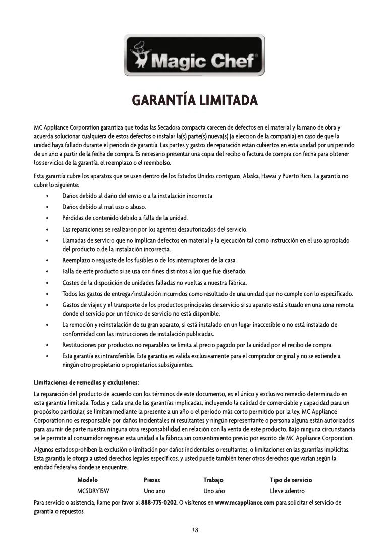 MCApplianceCorporationgarantizaquetodaslasSecadoracompactacarecendedefectosenel materialy la manodeObray