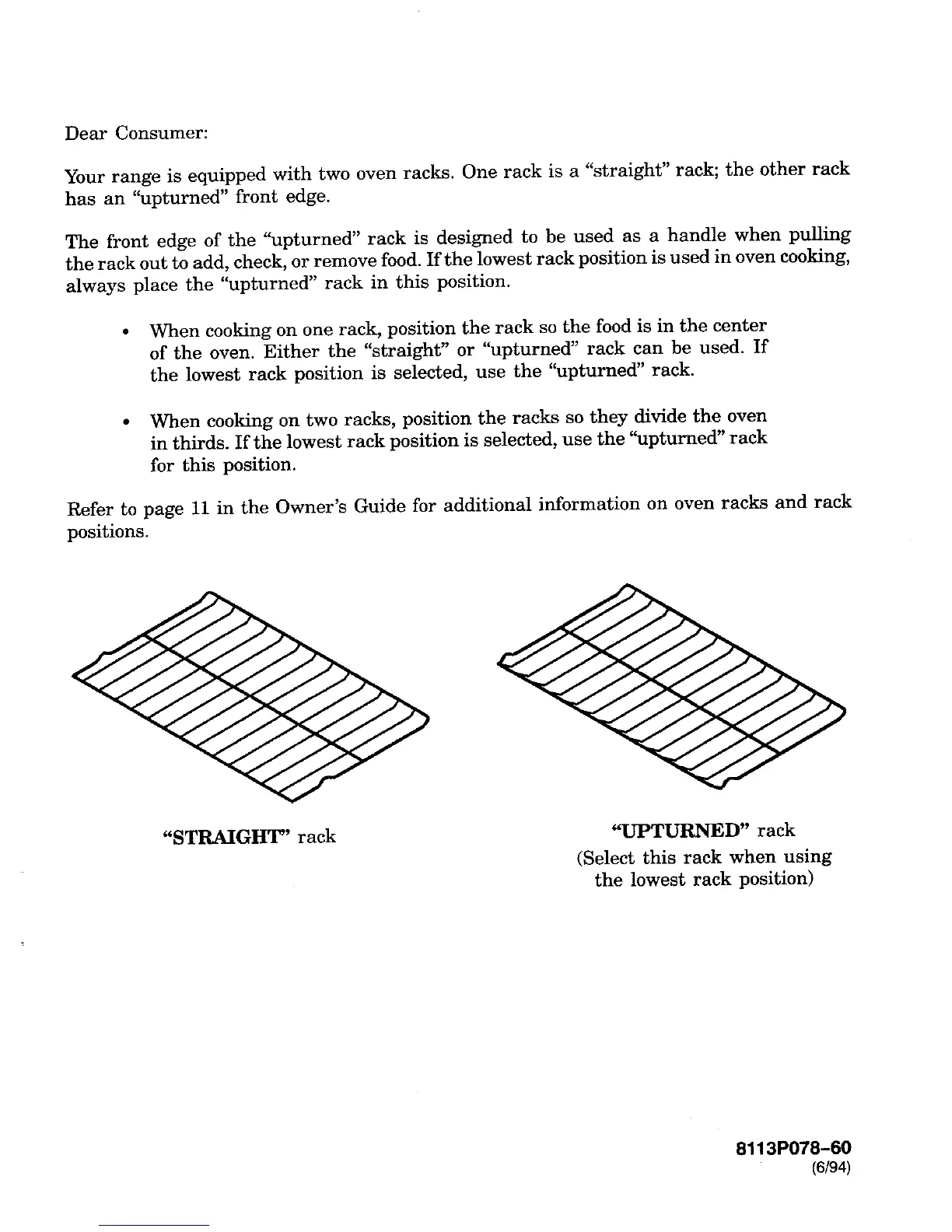 Refer to page 11 in the Owner's Guide for additional information on oven racks and rack