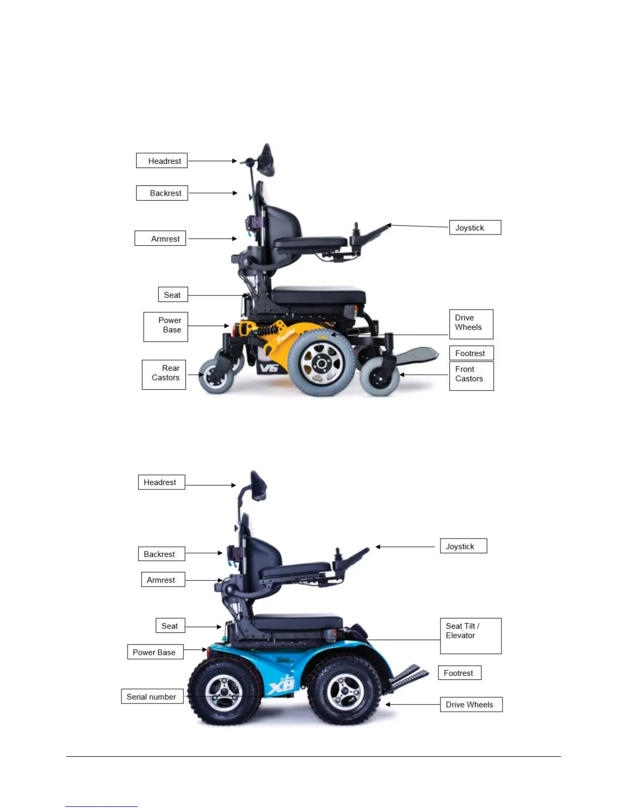 A Frontier V6 power chair is depicted below. This will help you identify some of the features referred