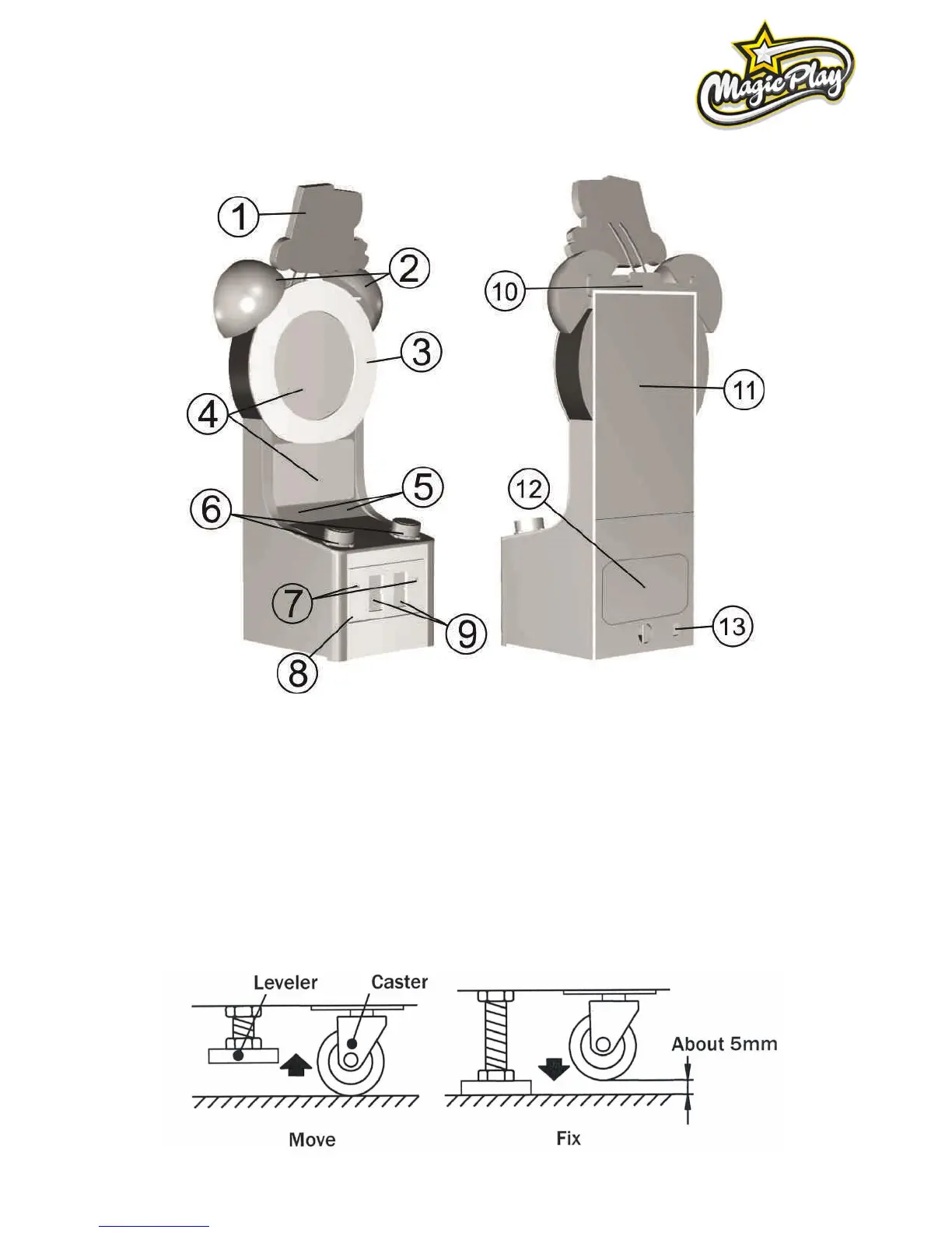 Install this machine on flat surface. Adjust levers to lift casters off the ground to level the game.