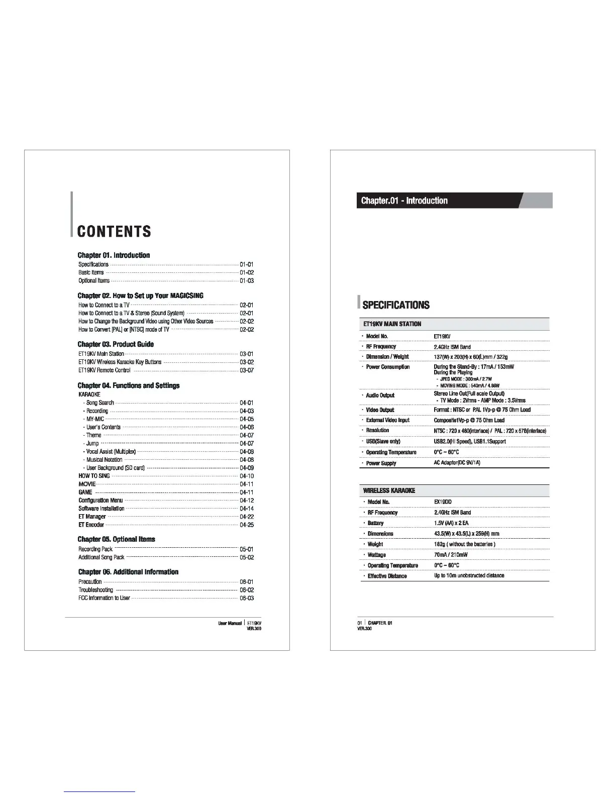 Magic Sing ET19KV - MAGICSING ET19 KV Specifications; Main Station Technical Details; Wireless Karaoke Microphone Specs