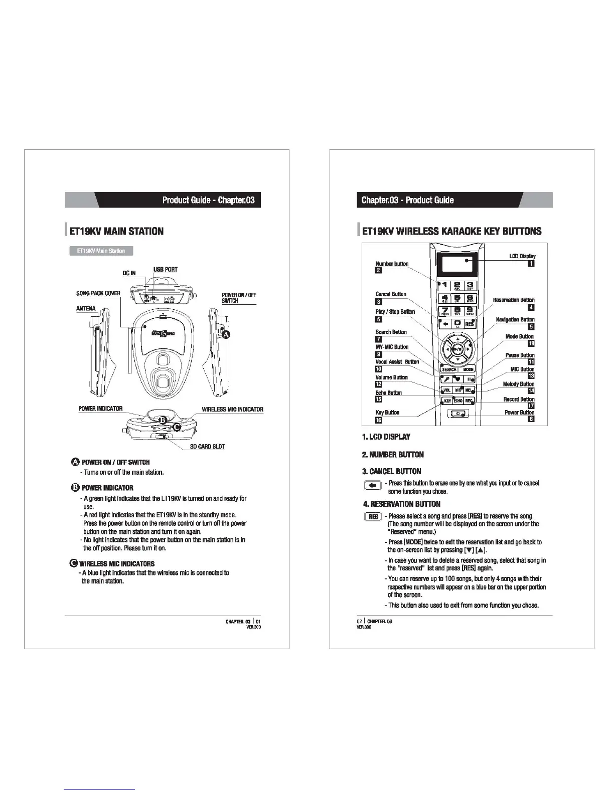 Magic Sing ET19KV - ET19 KV Product Overview; Main Station Components and Indicators; Wireless Karaoke Key Buttons (Part 1)