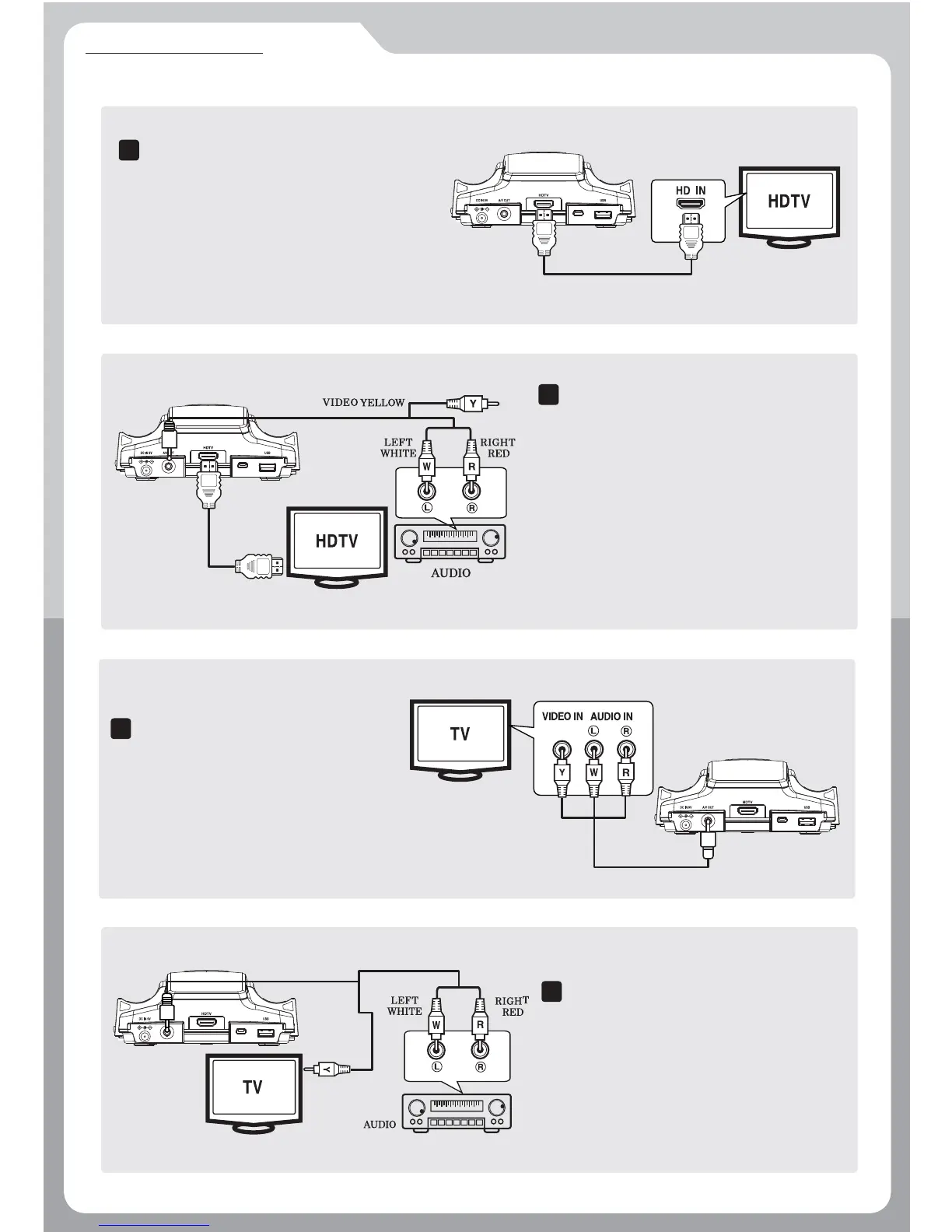 as 1. above. For audio, use the tri-color RCA cable.