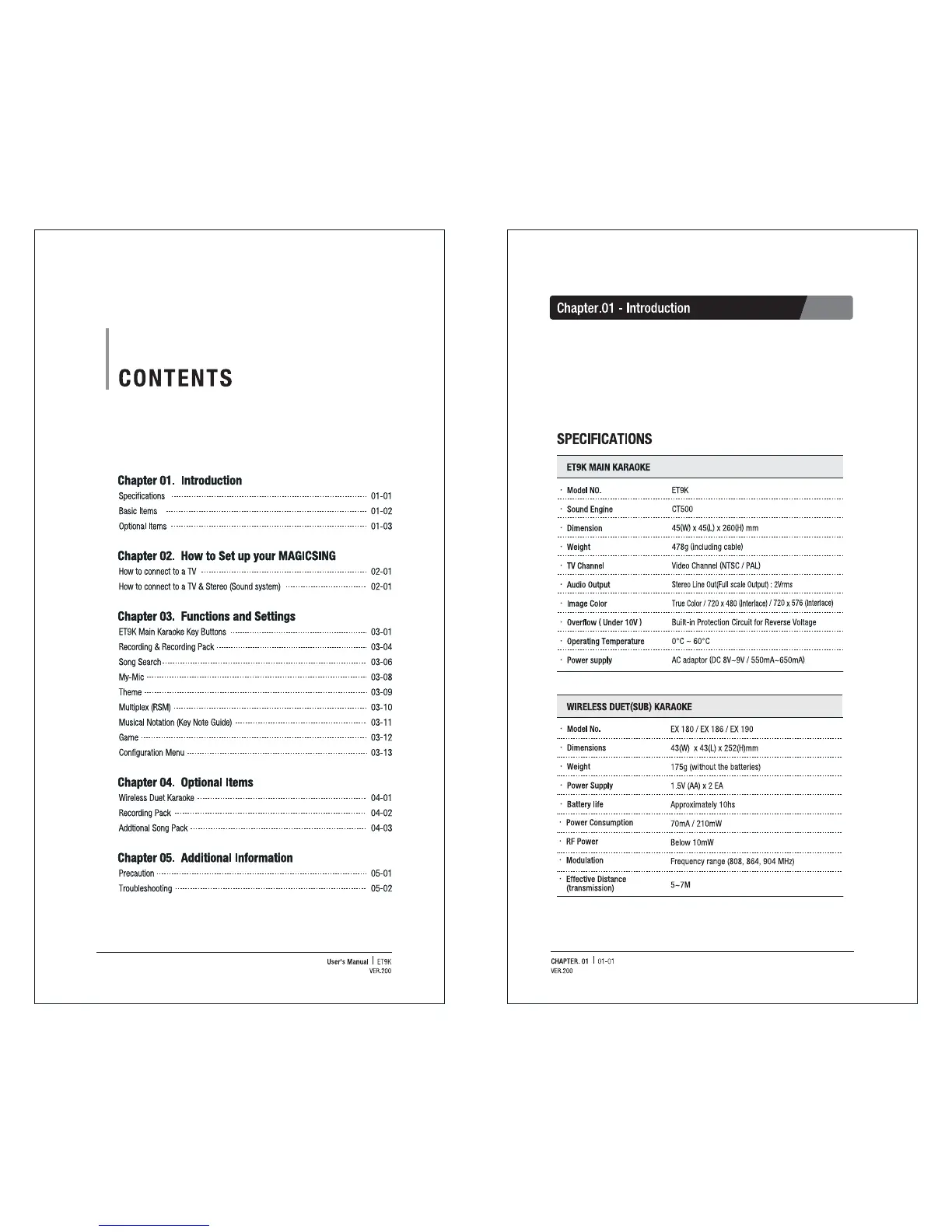 Magic Sing ET9K - Chapter 01: Introduction; Specifications (ET9 K Main Karaoke); Specifications (Wireless Duet Karaoke)