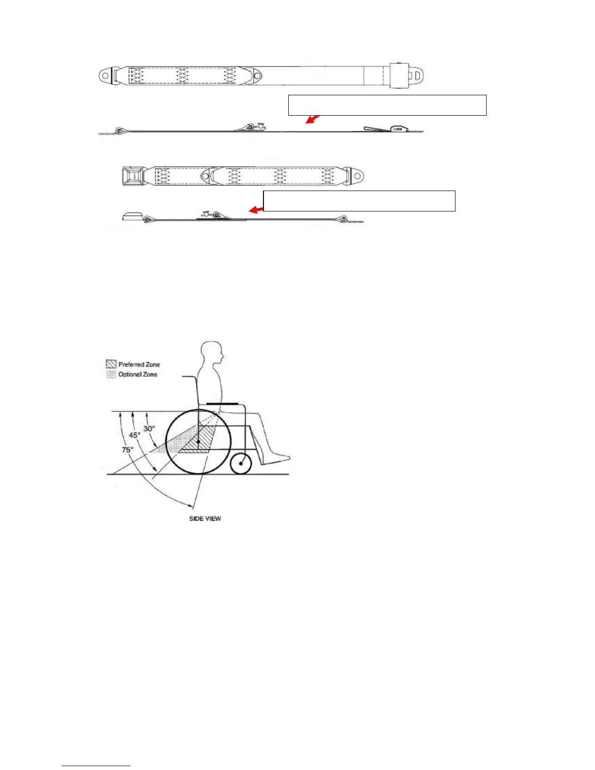 Belt restraints should not be routed outside of the wheelchair wheels or over the wheelchair arm