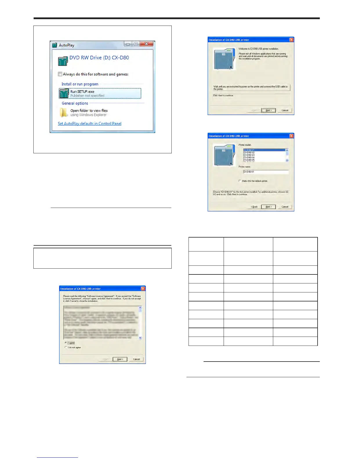 A [Installation of CX-D80 USB printer] screen appears.