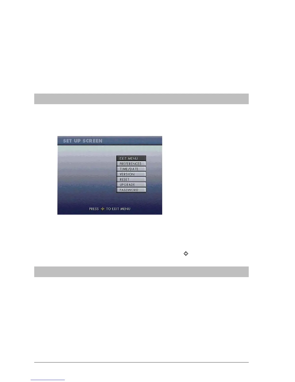 The rabbit icon will take you to the setup menu. This menu is described later