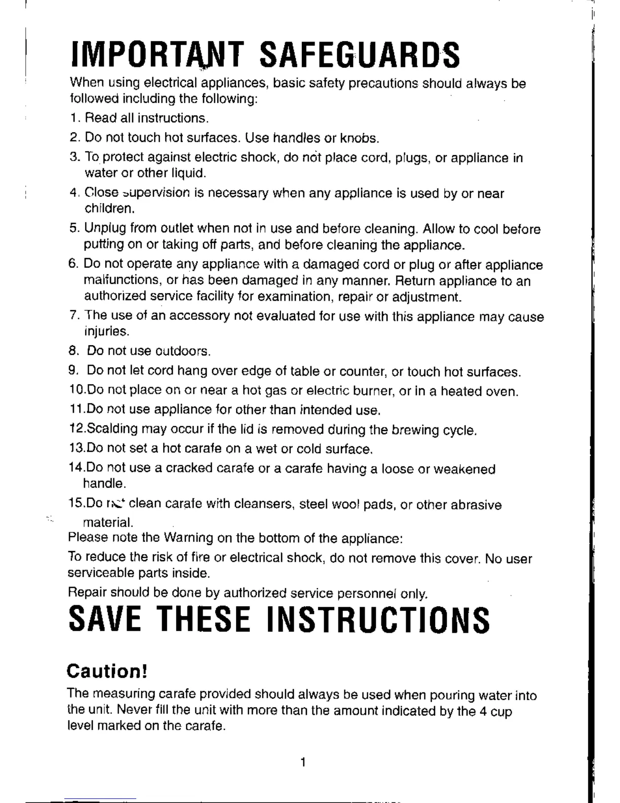 MagicChef 94155 - Important Safeguards; Appliance Warning; Cautionary Note on Carafe Usage