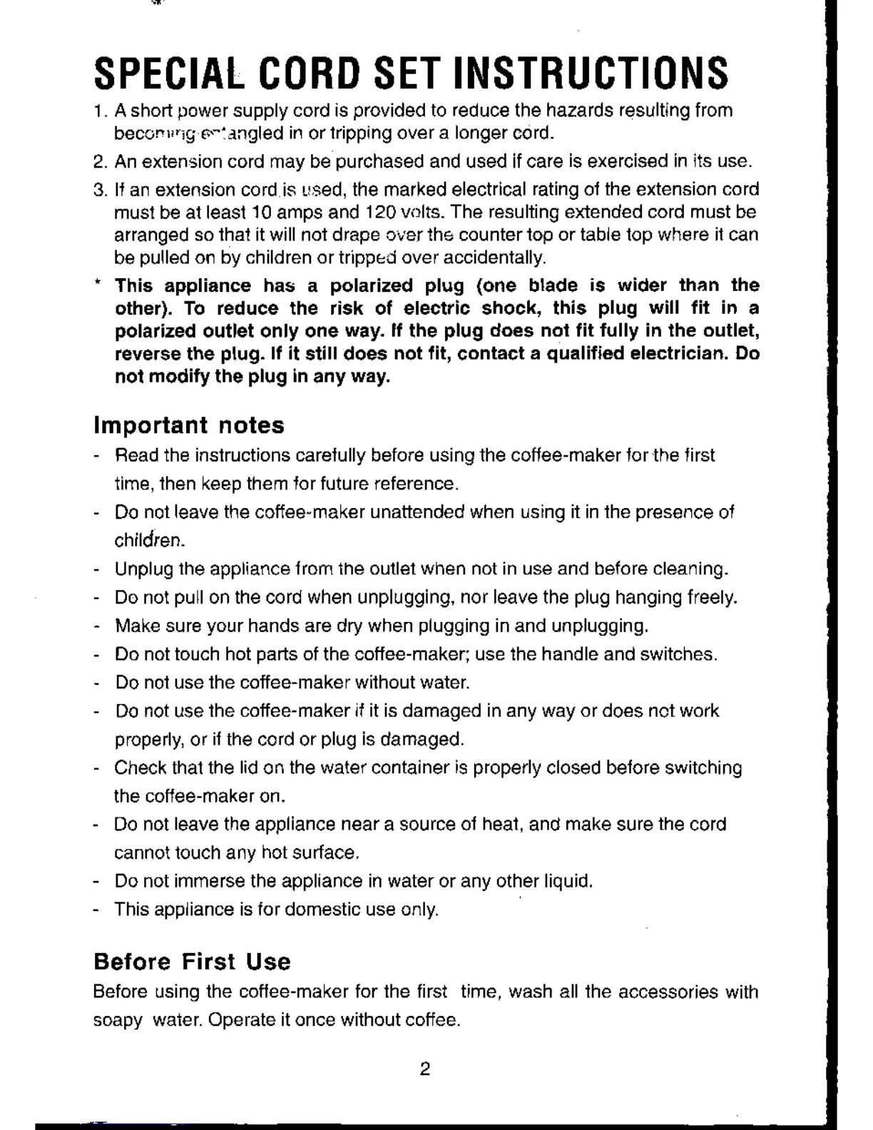 MagicChef 94155 - Special Cord Set Instructions; Polarized Plug Safety; Important Operational Notes; Preparation Before First Use