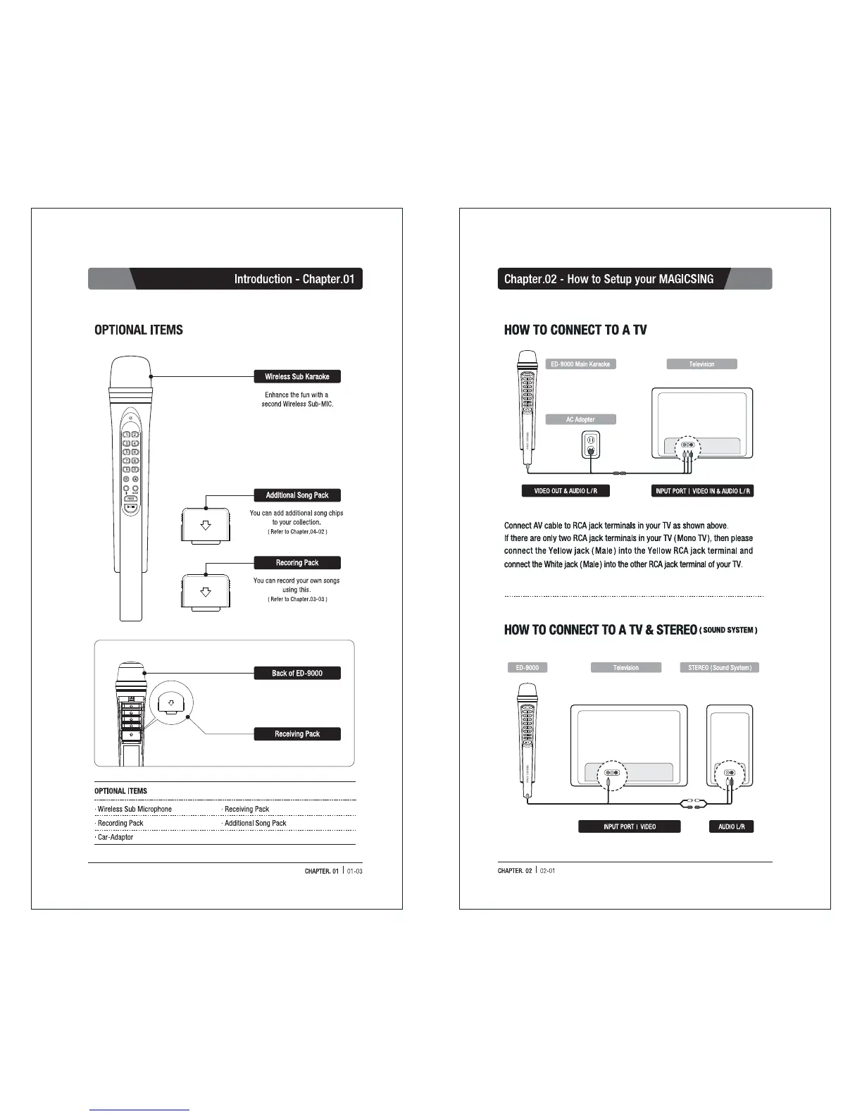 Magicsing ED-9000 - Optional Items; How to Setup your MAGICSING; How to connect to a TV; How to connect to a TV & Stereo; Sound system