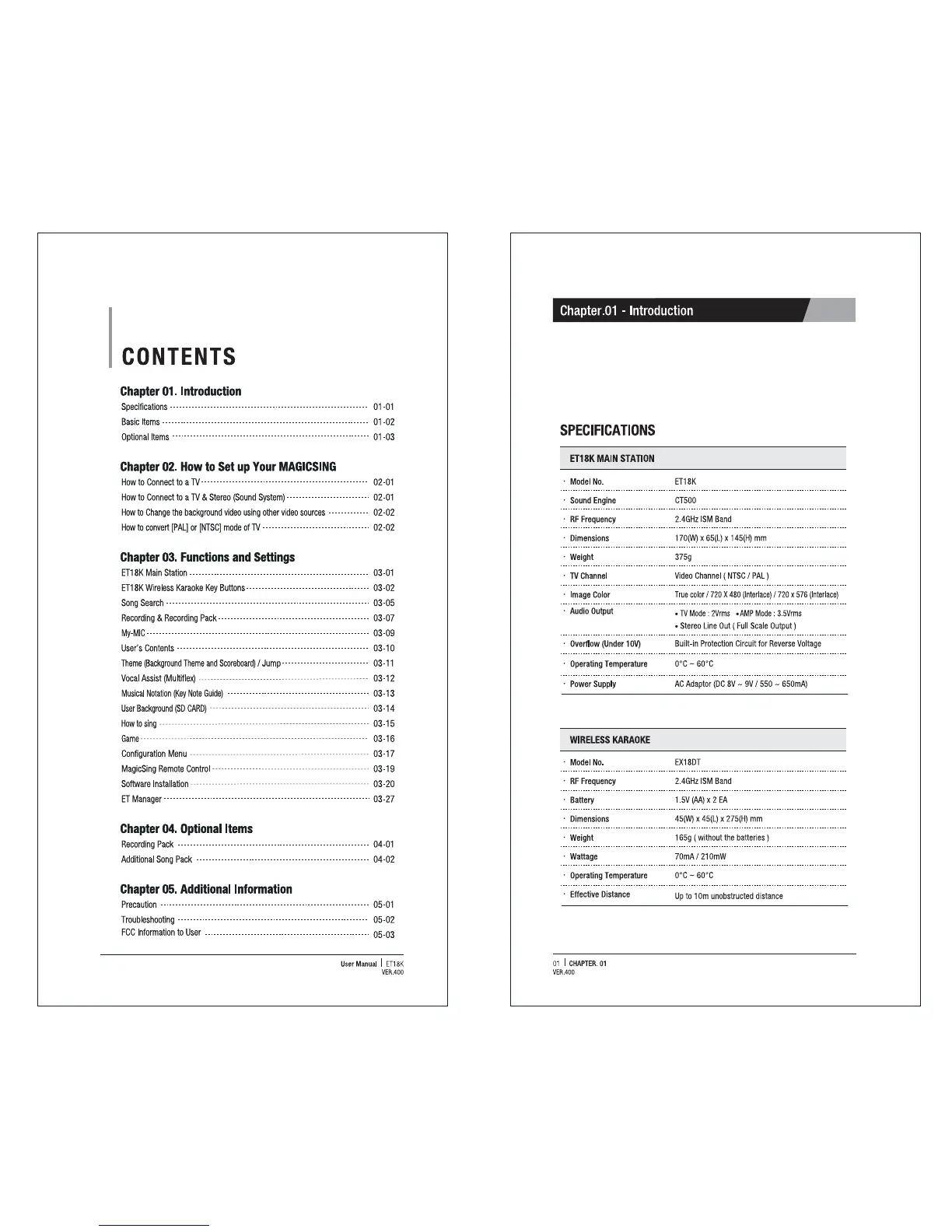 Magicsing ET18K - Chapter 01. Introduction; Chapter 02. How to Set up Your MAGICSING; Chapter 03. Functions and Settings; Chapter 04. Optional Items