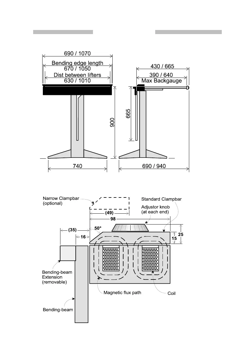 MAGNABEND 650E - Magnabend 650 E;1000 E Model Specifications; 650 E;1000 E Front and Side Elevations; 650 E;1000 E Cross-Sectional Detail