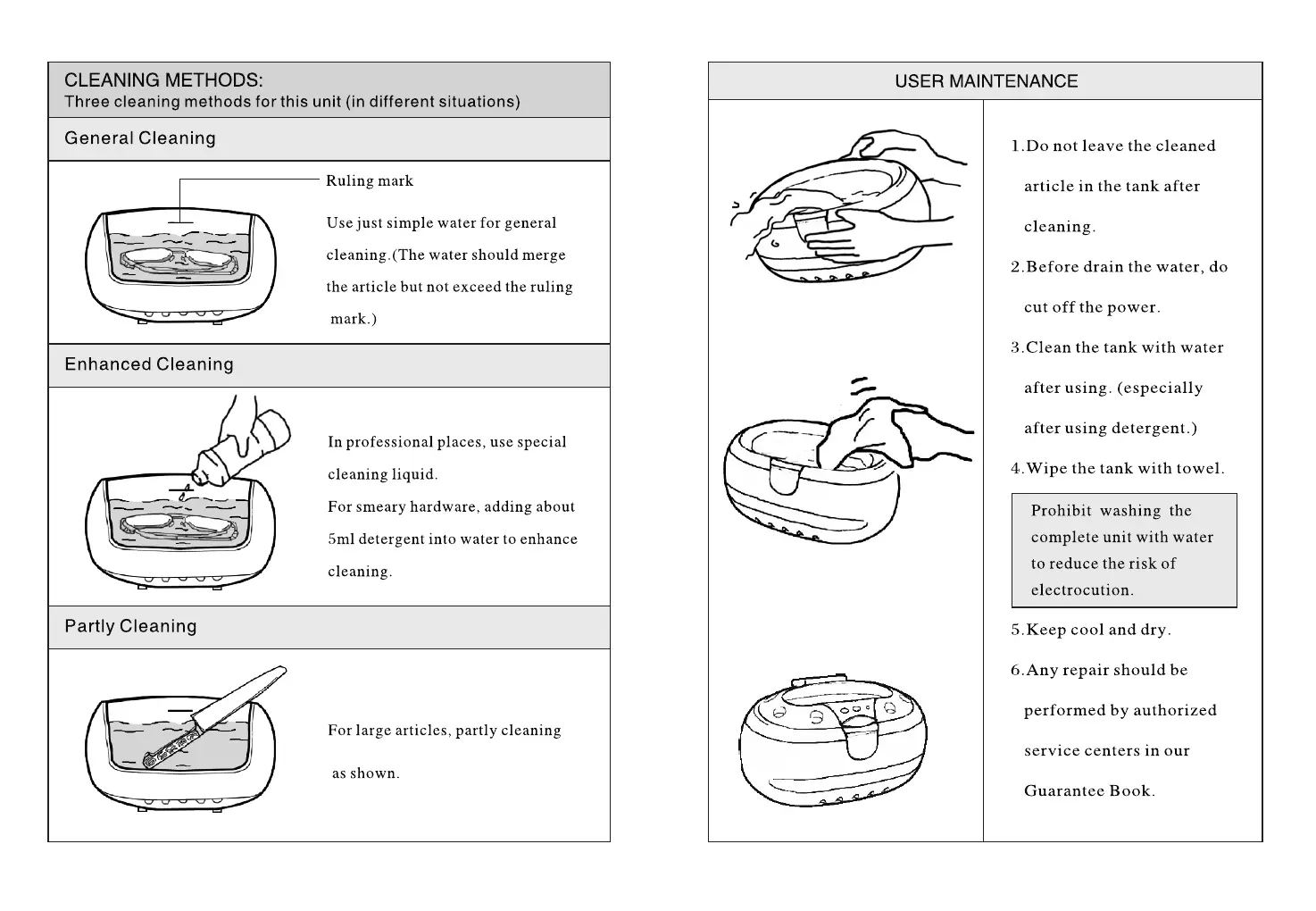 Magnasonic CD2800 - Cleaning Methods and User Maintenance; Ultrasonic Cleaner Cleaning Methods; User Maintenance and Care