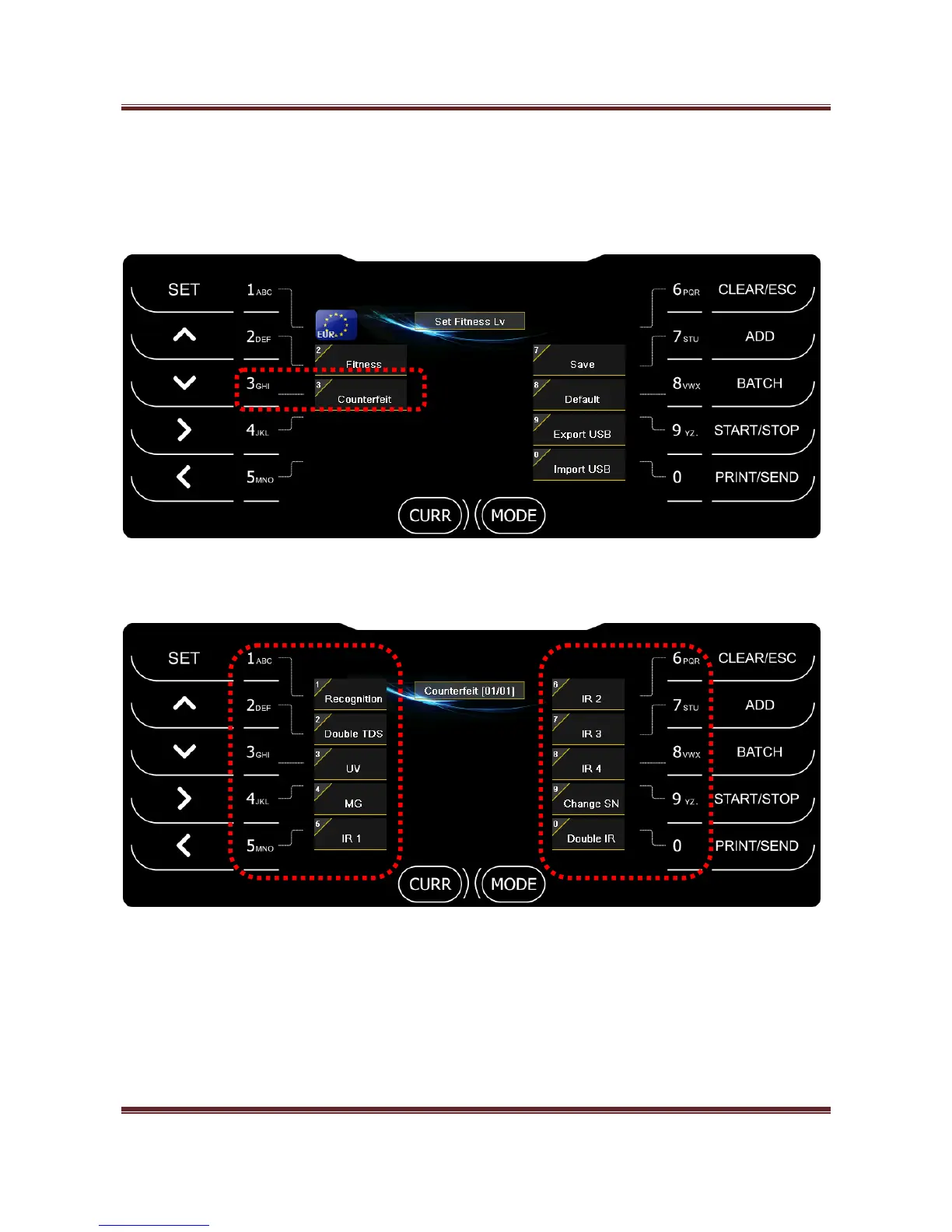 After press SET key and 3 key, you can enter Counterfeit Level mode.