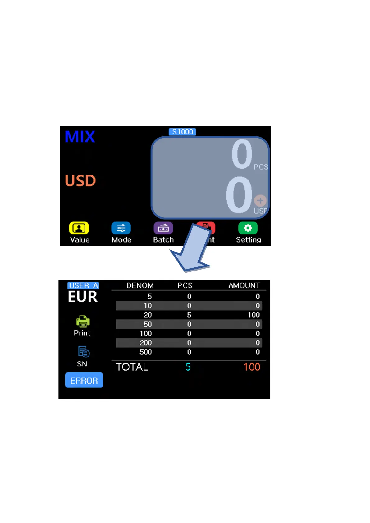 User can check the detail of the count result, serial number, and error of the banknote by touching