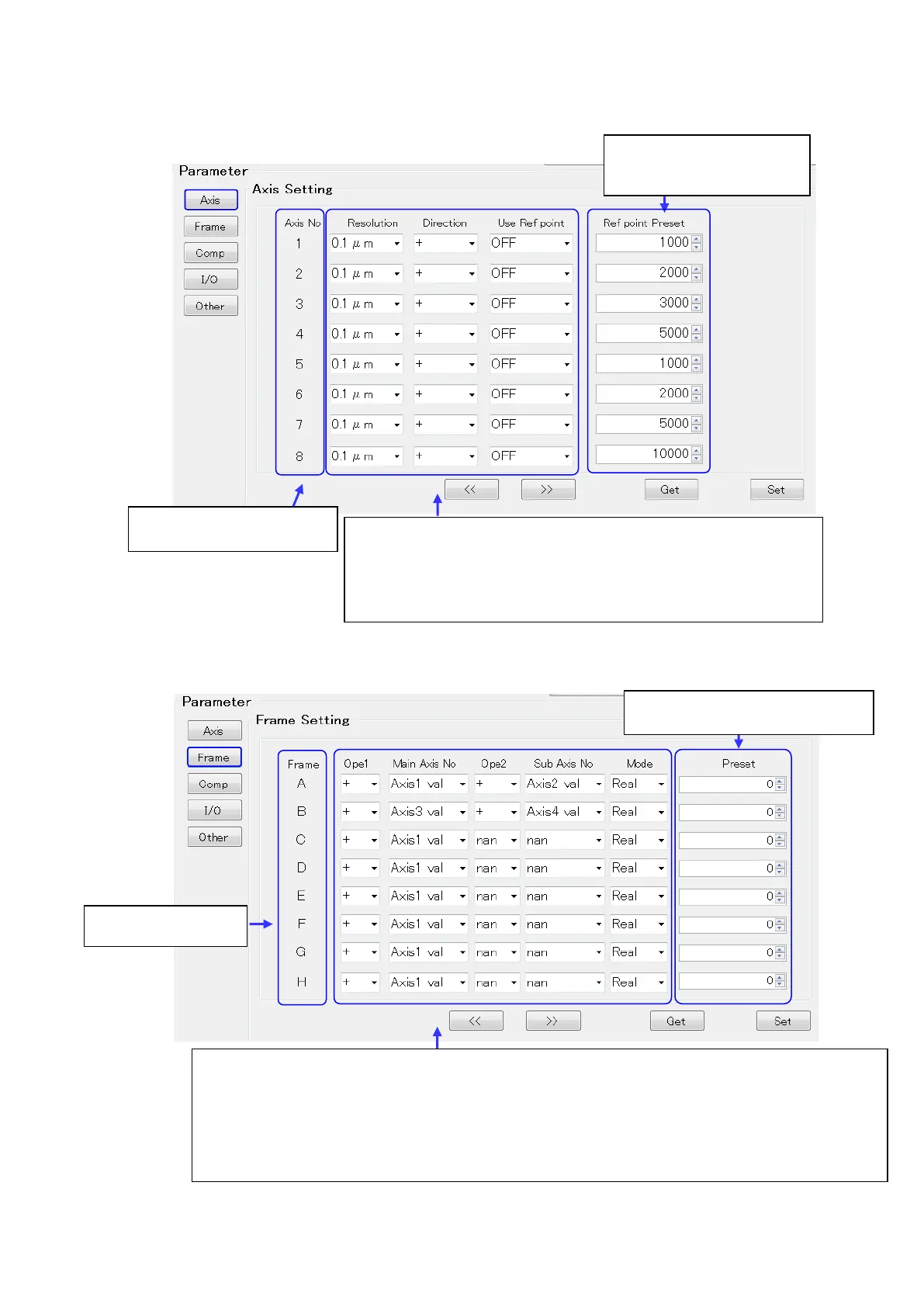 Ope1(+), Main Axis No.(Axis3 val), , Ope2(+), Sub Axis No.(Axis4 val),Mode(Real)