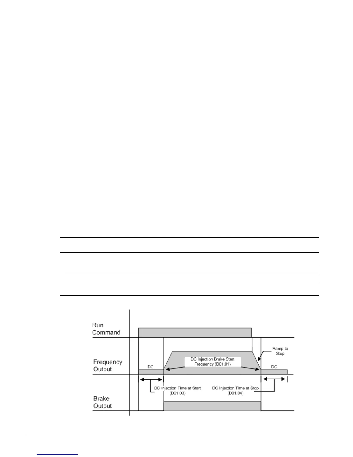 reaches the DC Injection Braking Start Frequency (D01.01 setting). Then the drive output is turned