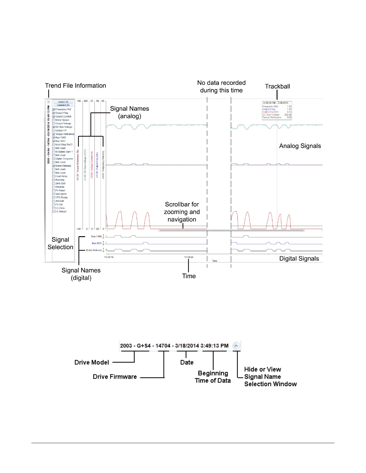 Trend view will display both analog and digital signals from the drive as well as signal names and ranges. These
