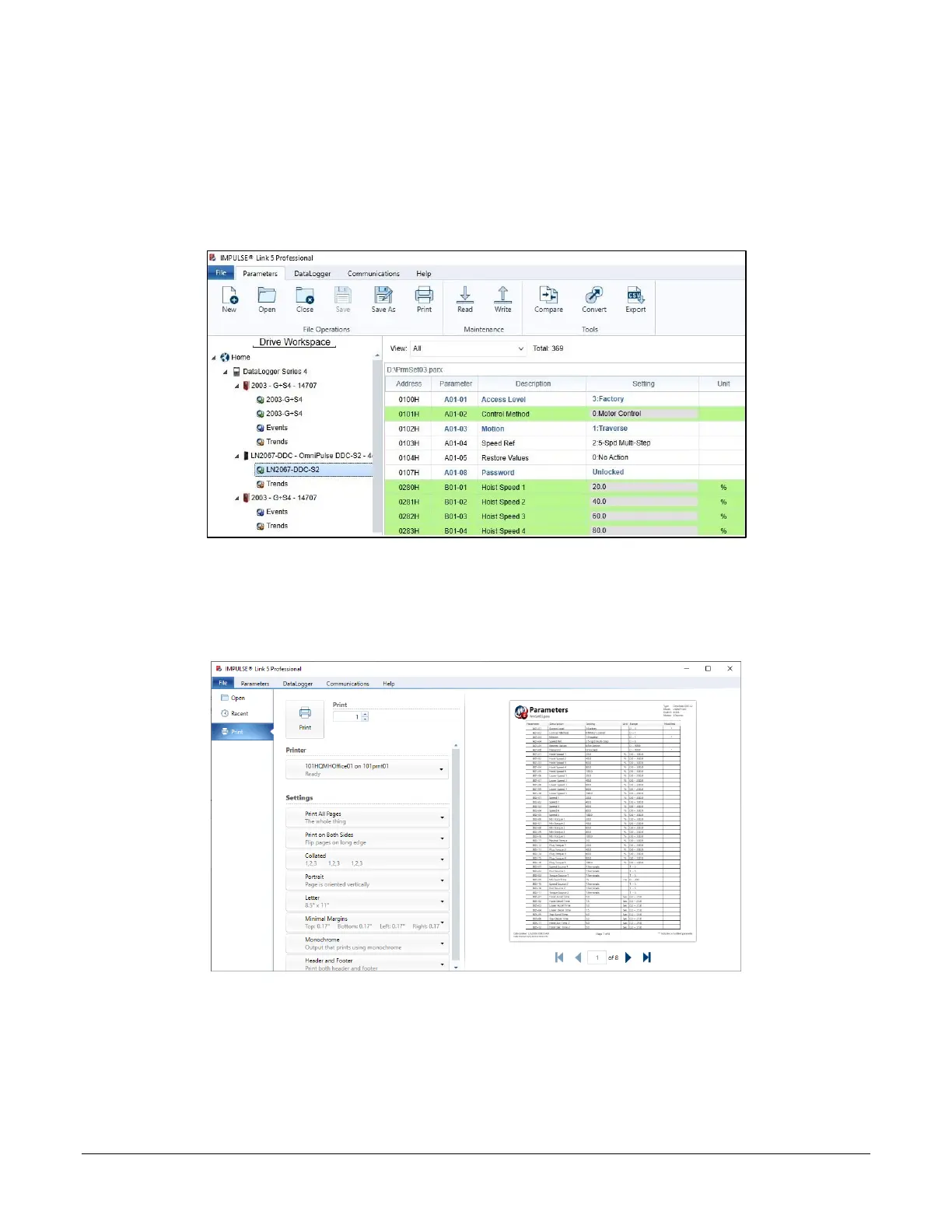 IMPULSE•Link 5 can print Parameter sets, Event information, and Trending data.