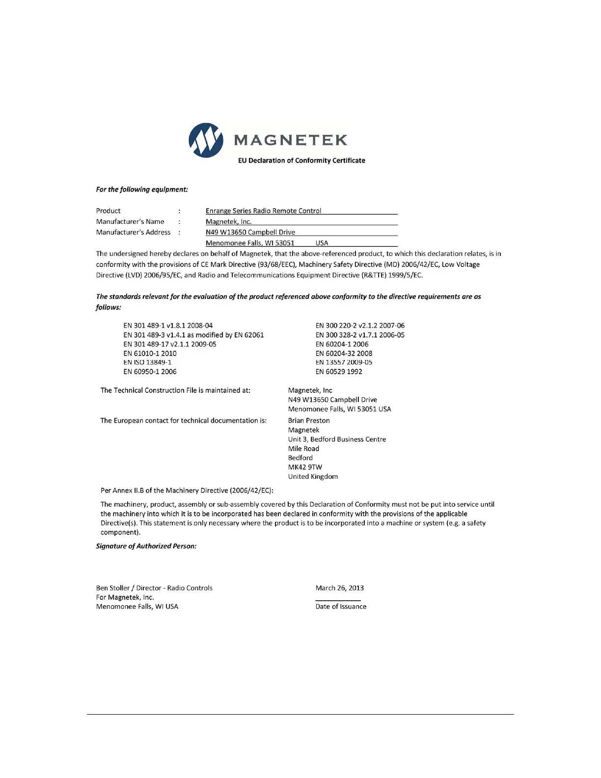 Magnetek MHR - 8 Eu Declaration of Conformity