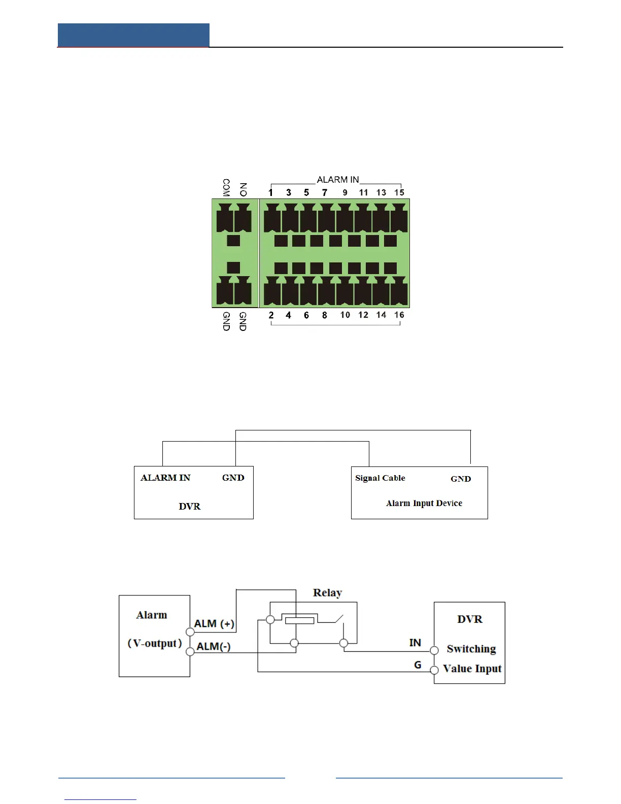 Alarm IN 1~16 are 16 CH alarm input interfaces. There are no type requirements for sensors.