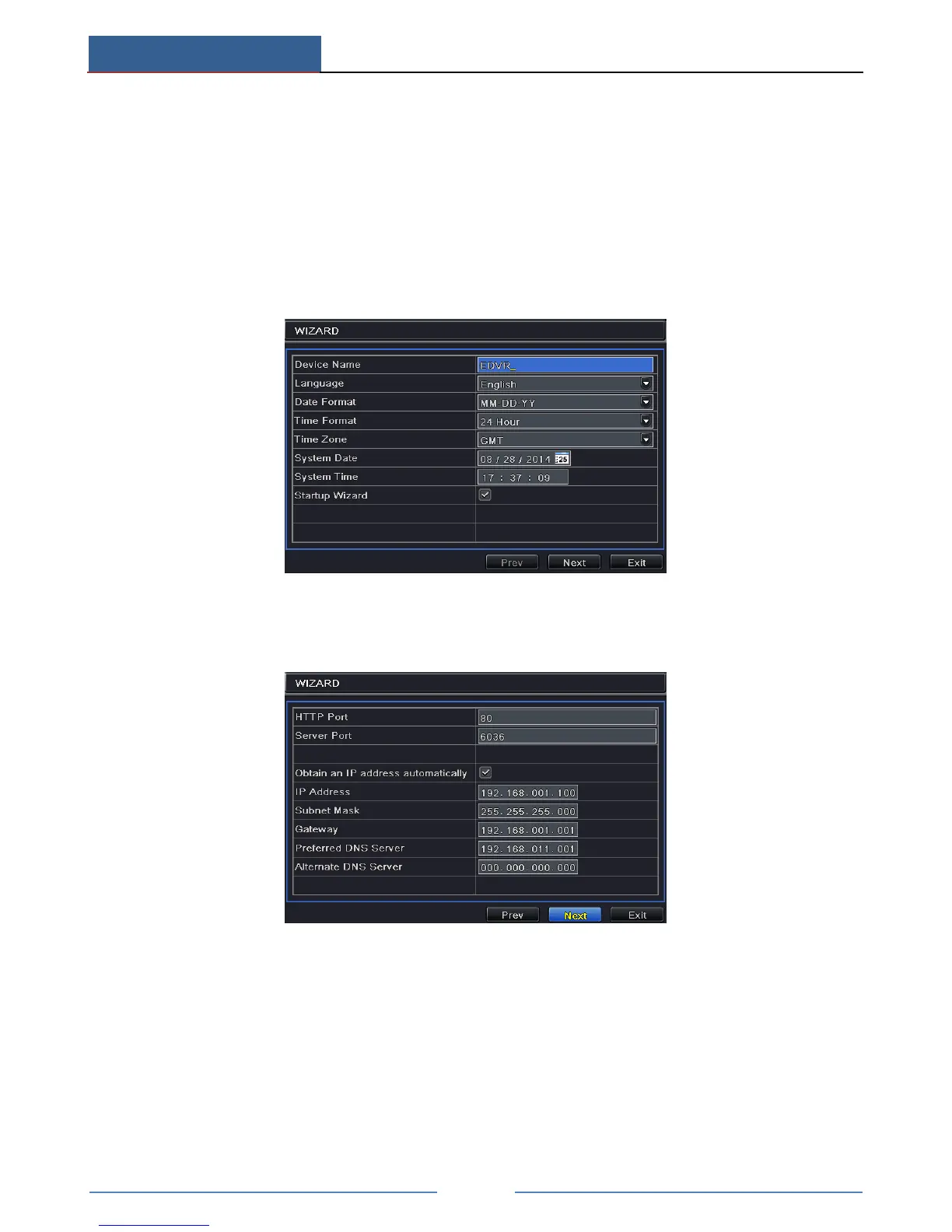 ① Set device name, language, data format, time format, time zone, system date, etc. Then