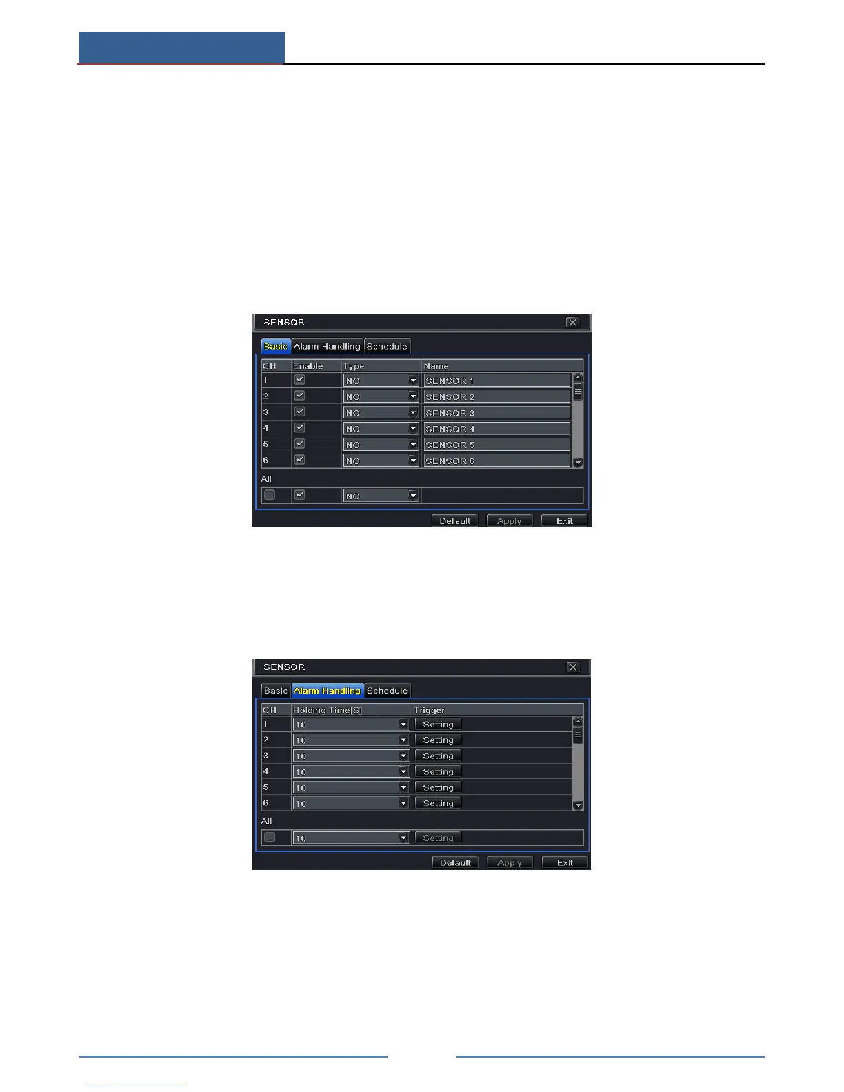 ① Go to Main MenuSetupAlarmSensorBasic tab.