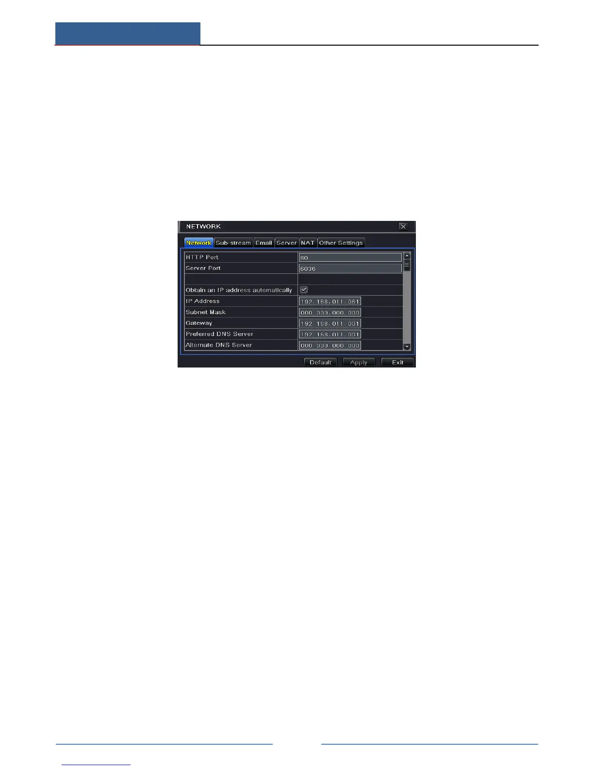 Network Settings includes six submenus: network, sub stream, Email, server, NAT and other