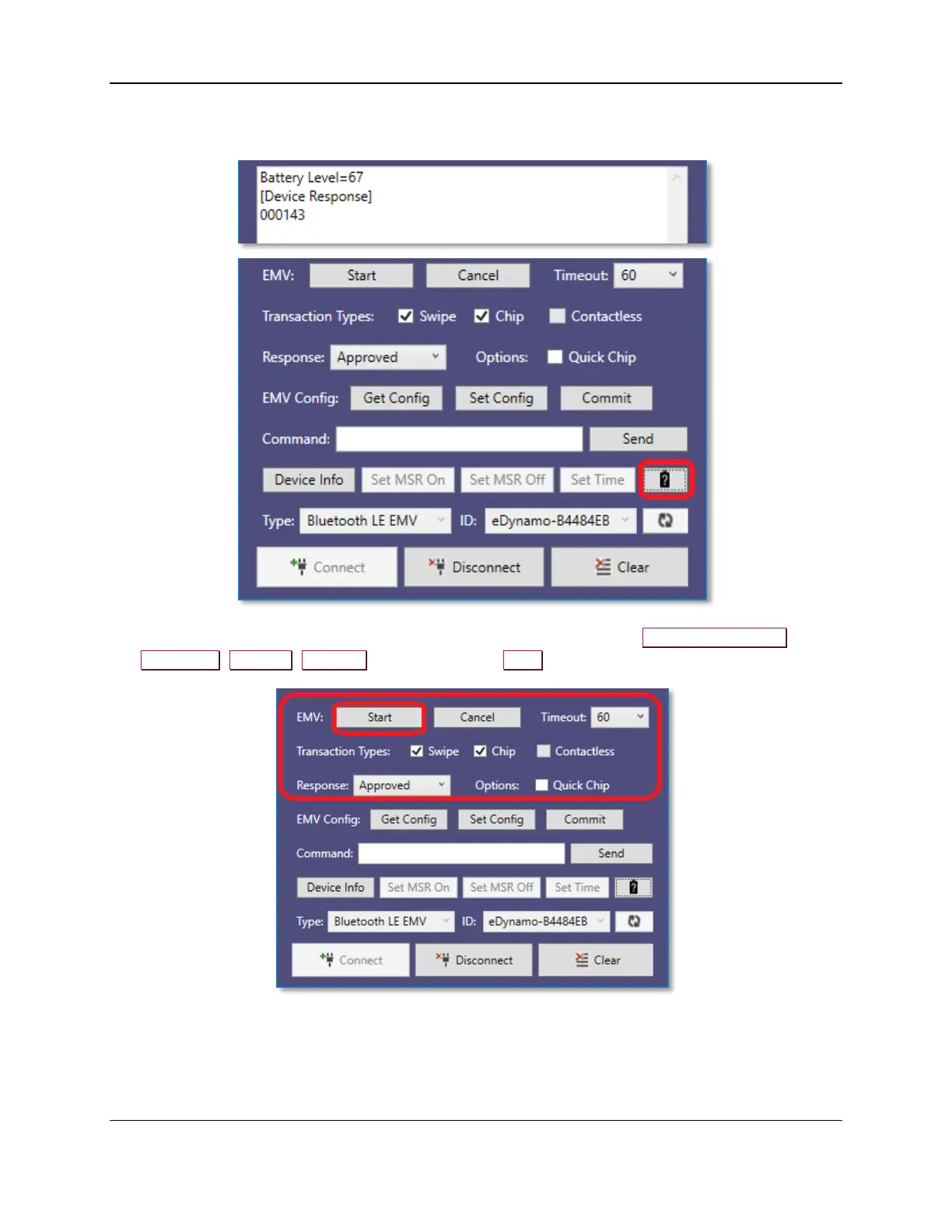 Response, Options, Timeout, and then press the Start button to begin an EMV transaction.