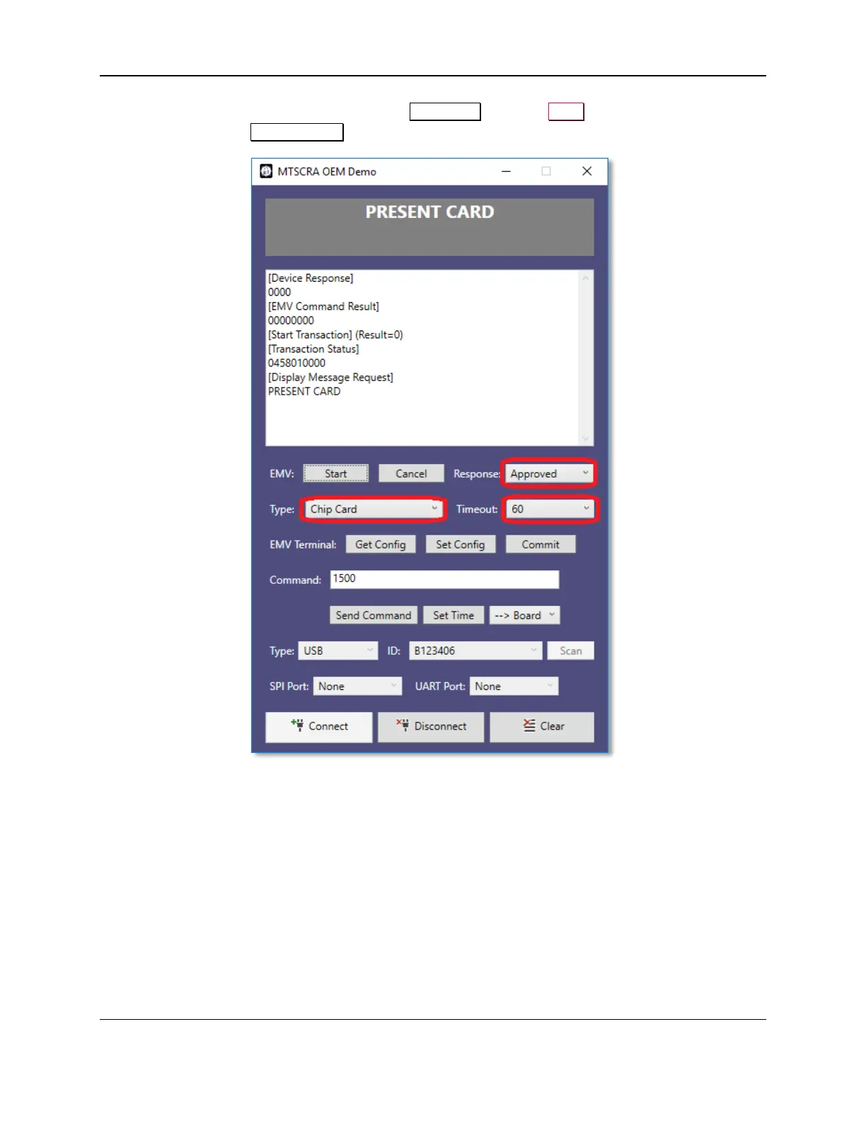 7) To begin an EMV transaction, select desired Response, press the Start button, and then insert the