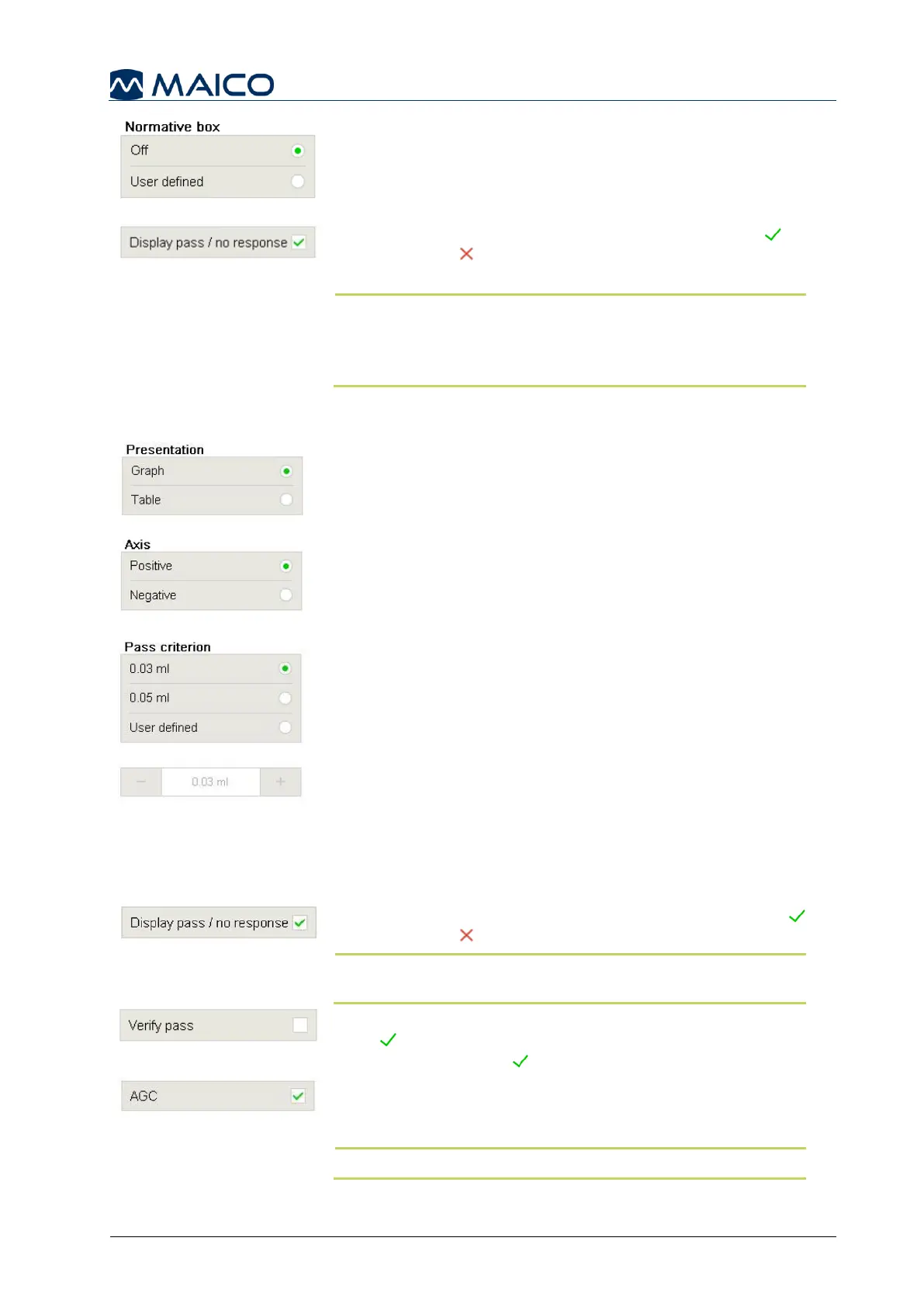 Display pass / no response: If active the result (Pass